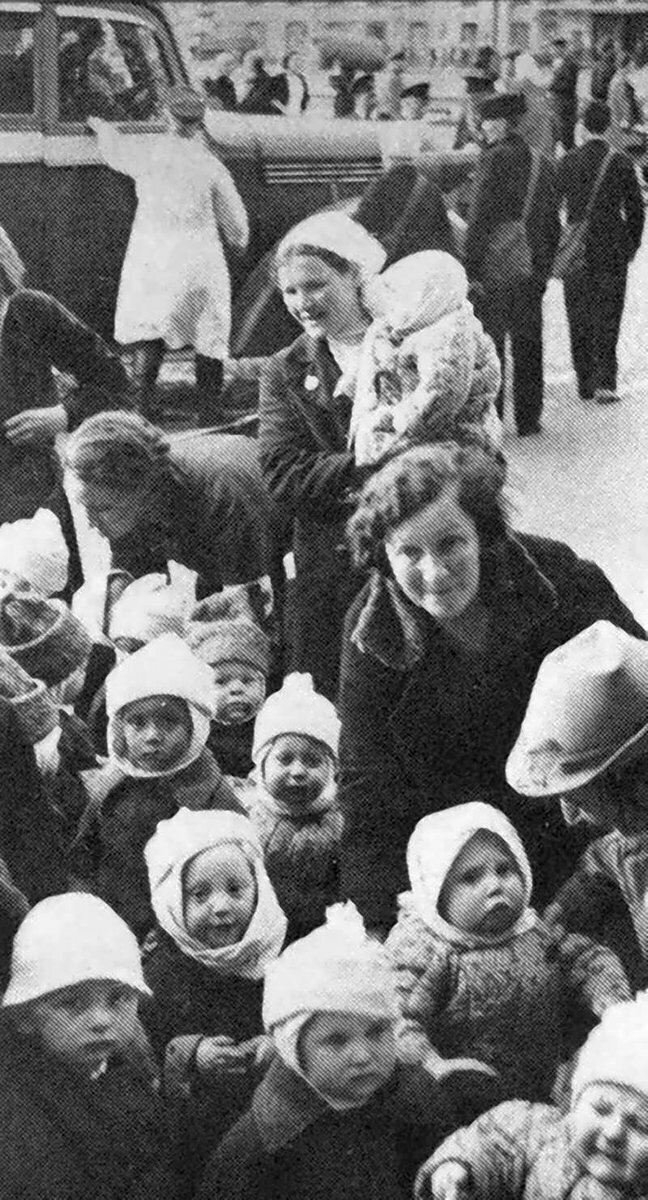 Эти женщины - воспитательницы, никого из родителей там нет. Сегодня об этом часто забывают, но родители обычно не имели права покинуть заводы, на которых они работали - согласно Указу от 26 июня 1940 года "О переходе на восьмичасовой рабочий день, на семидневную рабочую неделю и о запрещении самовольного ухода рабочих и служащих с предприятий и учреждений". Позже это положение было подверждено Указом Президиума Верховного Совета СССР от 26 декабря 1941 года, которым рабочие и служащие военной промышленности и смежных с ней отраслей на время войны прикреплялись к заводу, самовольное оставление места работы считалось преступлением.