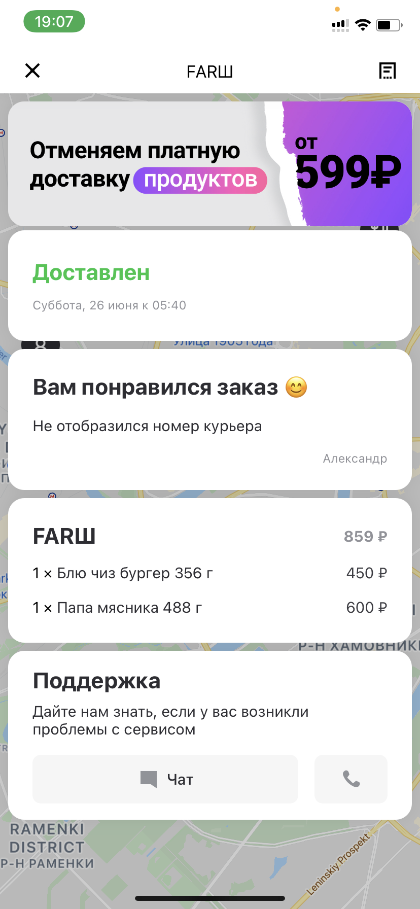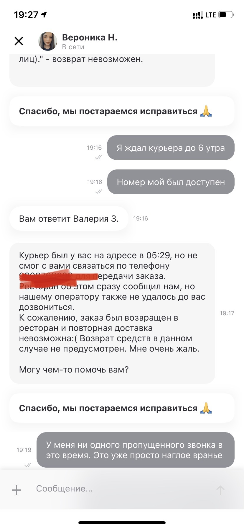 Выглянул за дверь - никого. Поскольку было уже около 5 утра и светало - решил подождать курьера у входа в дом на лавочке. Сижу, жду, обещали до 5;50 привезти. На часах уже 6. Ну мы цари, можем и позвонить. Но вот чудо - ни номера курьера, ни курьера на карте нет, ведь заказ уже доставлен. В самой бургерной не ответили да и не было там наверное никого в 5 утра. Ладно, связываюсь с Деливери по поводу компенсации. И получаю очень интересный ответ