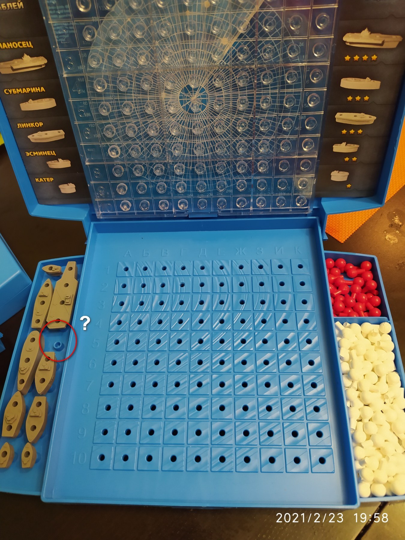 На 23 февраля жена подарила старшему сыну "Морской бой". Игрушка производства компании «Рыжий кот» (РФ). После распаковки, к сожалению, внутри не оказалось одного однопалубного корабля.