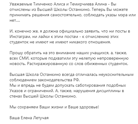Елена Летучая, которая занимает пост худрука в «Высшей школе "Останкино"», встала на защиту вуза в скандале с отчислением студенток за лайки. Она заявила, что девушек отчислили за то, что они якобы недовольны указами Путина и Собянина.