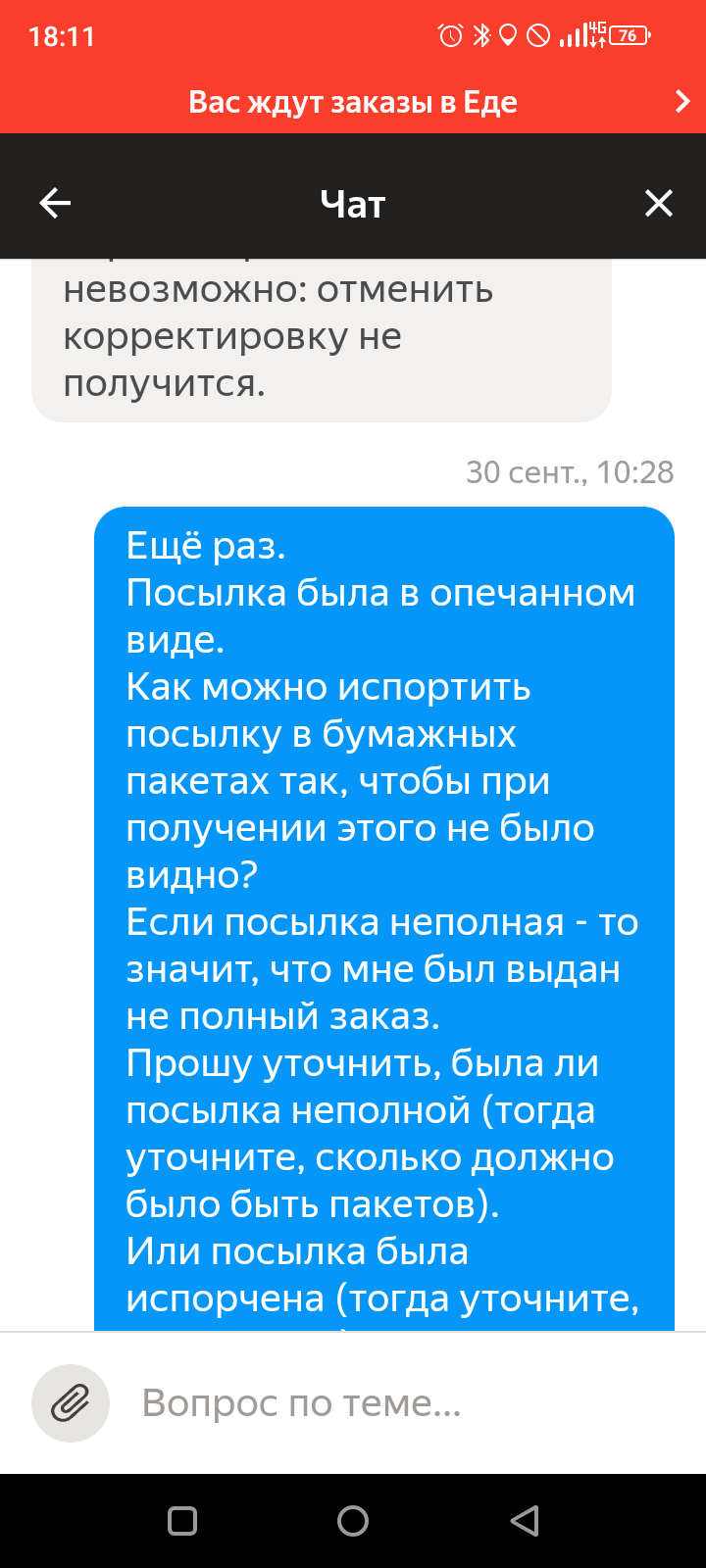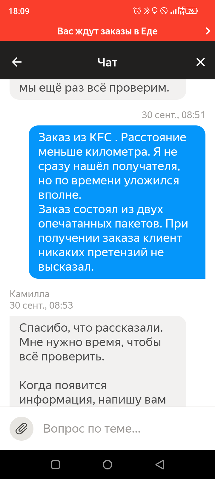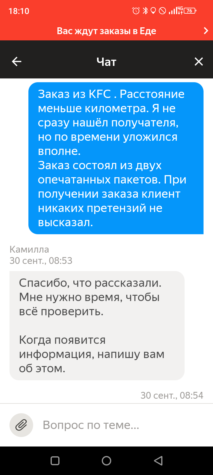 Заказ из KFC (да, они не все переименовались в "Ростикс"). Расстояние метров 500. Два опечатанных пакета.
