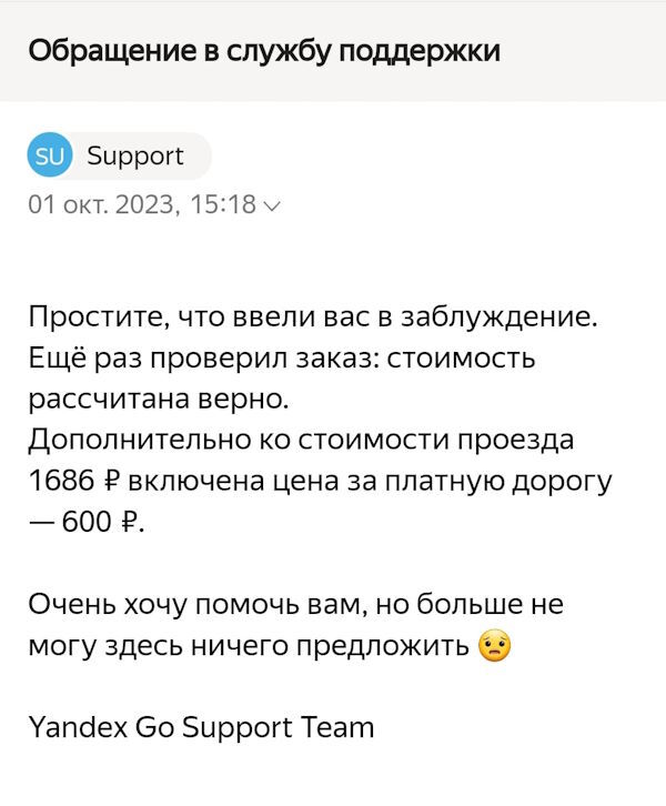 Яндекс: "мы написали что проезд по платной дороге входит в стоимость, но мы все таки возьмем с вашей карты деньги за платную дорогу, а вы простите нас что мы ввели вас в заблуждение..."