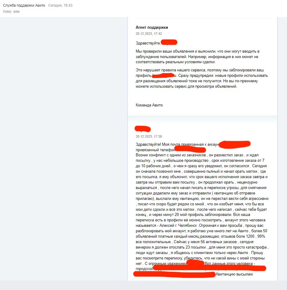Этот товарищ написал жалобу на папин аккаунт. Авито его заблокировал с комментарием «Навсегда». Папа позвонил в компанию. Ему сказали: «Пишите в поддержку, мы некомпетентны решать подобные вопросы». (Зачем тогда нужна горячая линия, остаётся загадкой). Папа писал. Ответ на первом скрине.