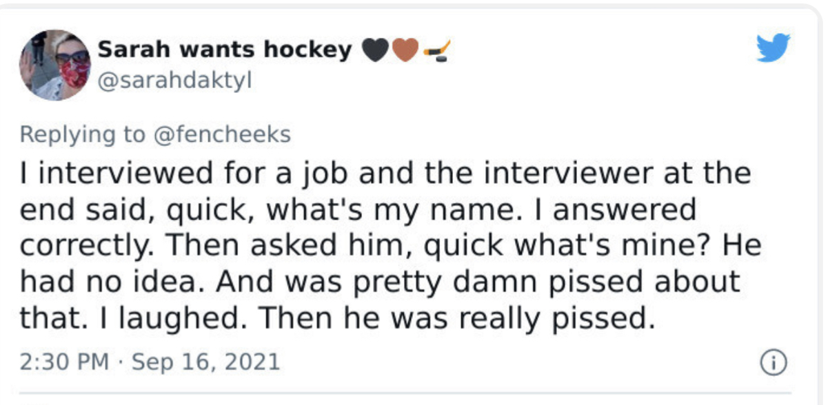 Я была на собеседовании и в конце интервьюер спросил: ‘Быстро, как меня зовут?’. Я ответила. Затем я сказала: ‘Быстро, как меня зовут?’. Он не знал, и разозлился. Я засмеялась. Тогда он очень разозлился.