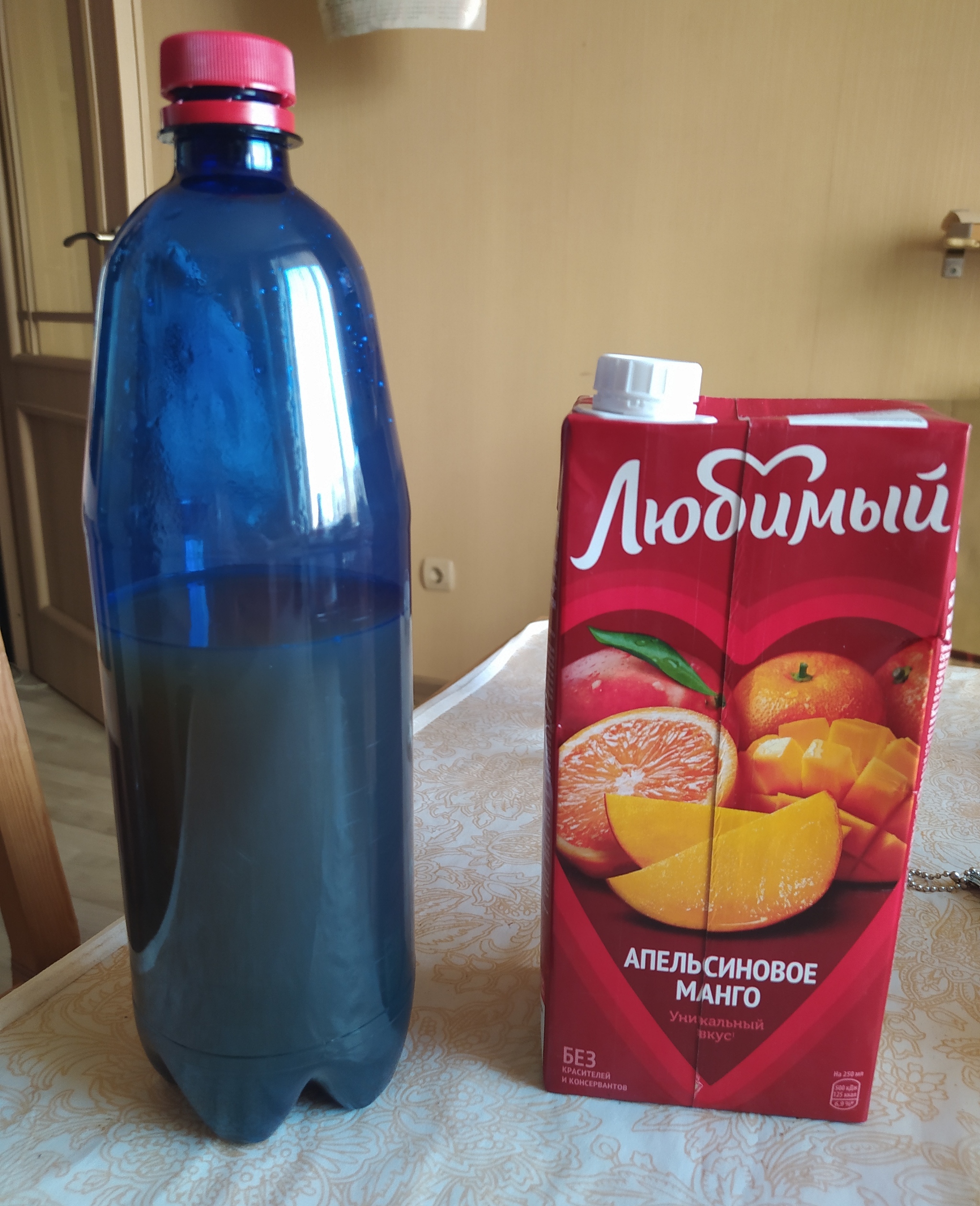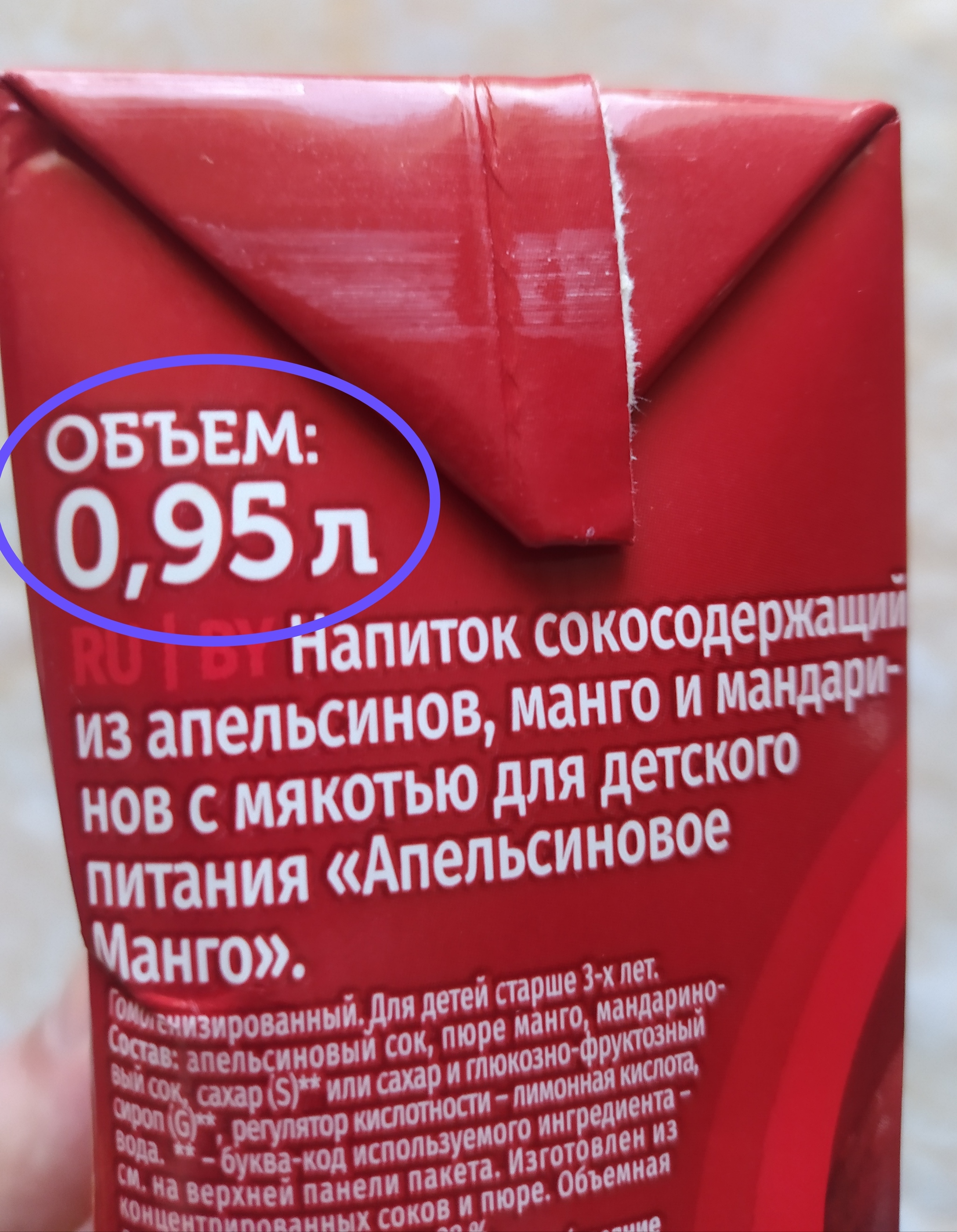 Но мы решили проверить эмпирически, вдруг показалось. Выяснилось, что в почти литровой таре всего 600 миллилитров сока (три стакана по 200 мл). Объем синей бутылки на фото – ровно литр.
