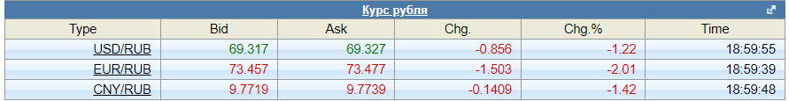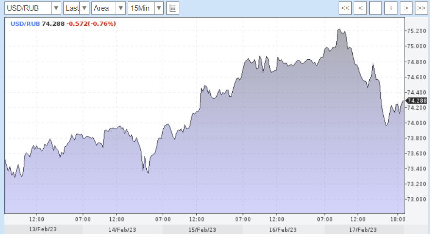 Посмотрим на график. Рубль начал неделю на 73.400, закончил неделю на 74.288. Падение составило 0.888 рубля, или 1,2% от цены открытия.