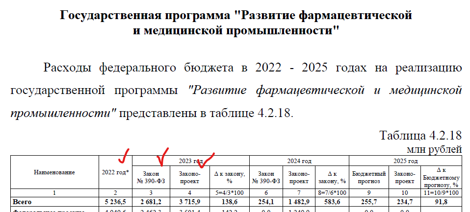 МТ пишет: Расходы по госпрограмме «Развитие фармацевтической и медицинской промышленности» уменьшаются на 29% — с 5,236 до 3,715 млрд рублей. Уменьшаются по сравнению с чем? С фактом 2022 года?