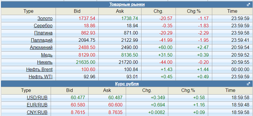 Товарная и валютная биржа. Здесь всё просто замечательно. Кроме, разве что, золота. Низковата цена. А так - рубль в середине коридора, нефть Brent более 100, Urals (https://www.profinance.ru/chart/urals/) - вообще 82+. Газ TTF (https://www.profinance.ru/charts/ttfusd1000/lc17) закрепился выше 3000 долларов за 1000 кубов. Очень симпатично.