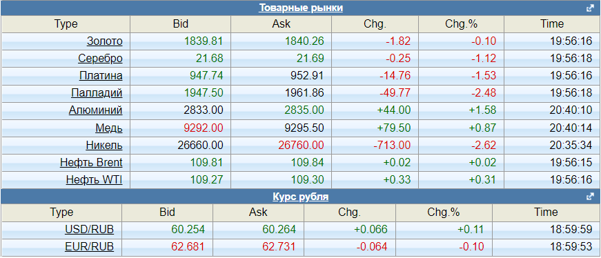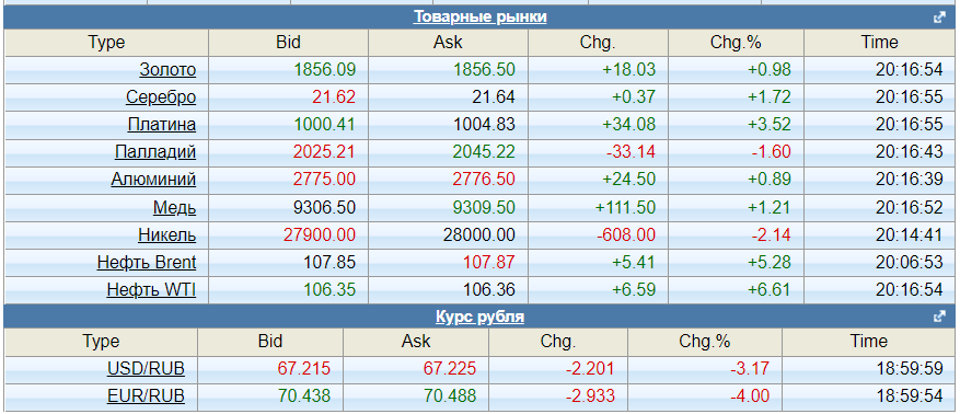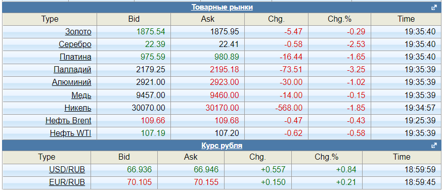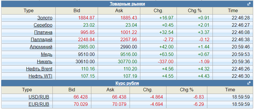 Товарная и валютная биржа: Ну про Рубль все уже знают. Нефть тоже прелесть - выше 110. Золотце припало. Но не страшно, чуть ниже комфортных 1900.