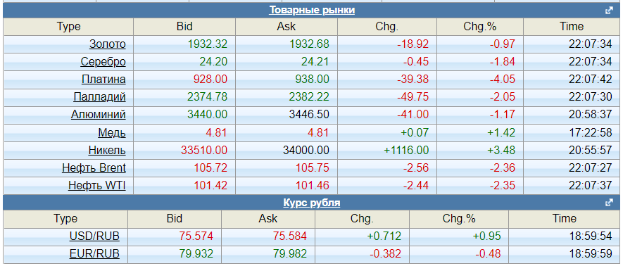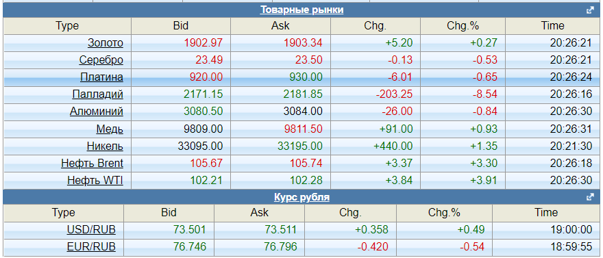 Валютная и товарная биржа. Сходил наш зайчик (рубль) погуляти. Аж ниже 73 заглядывал... Но решил вернуться в родной коридор 75 - 85. На привычном уровне как-то спокойнее. Нефть упала заметно, но выше 100 - любой уровень хорош. Золото тоже припало, но не ниже границы коридора 1900 - 2000. Всё спокойно.