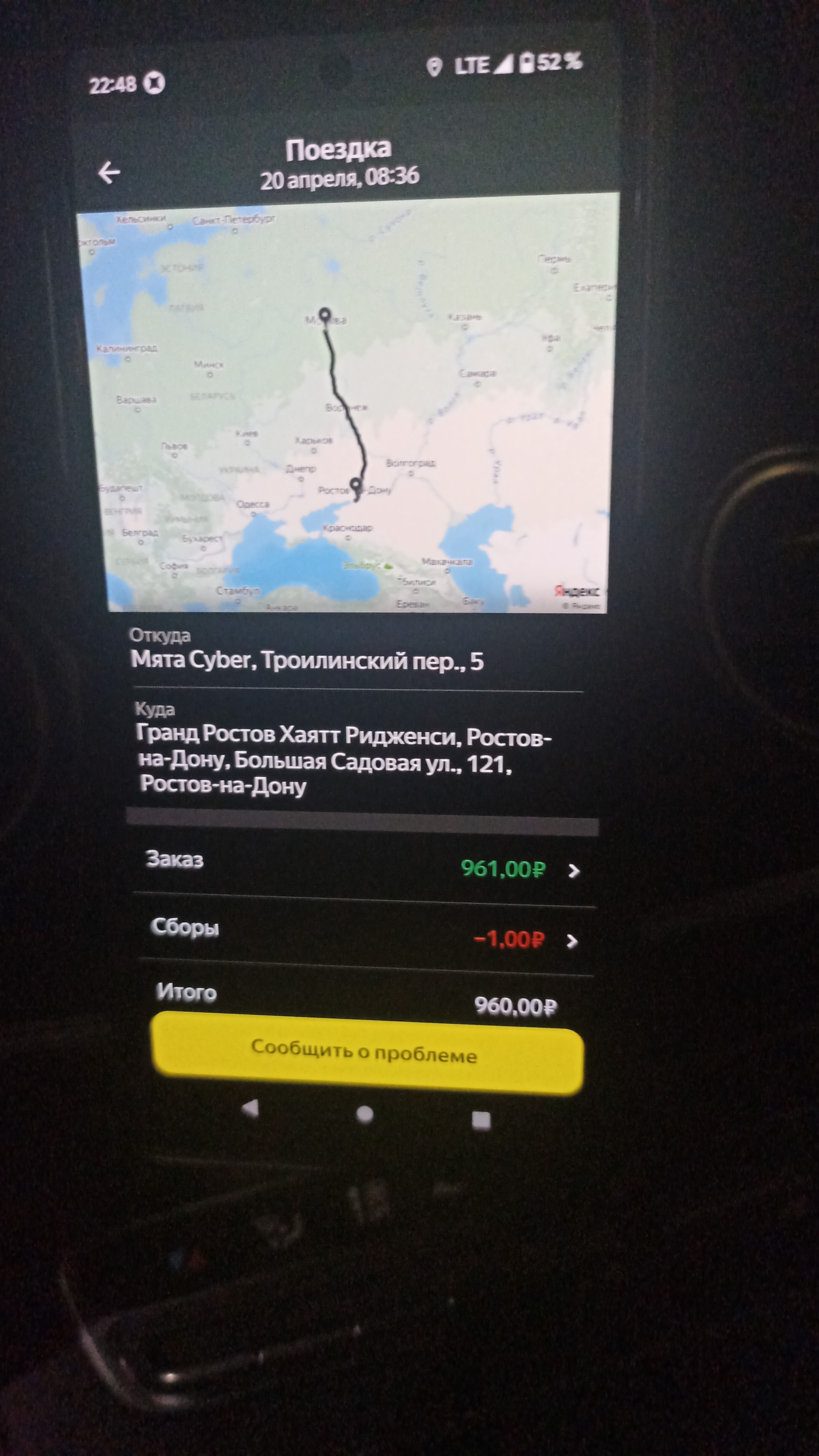 Это за поездку по прямому участку в 4 километра в Ростове. С двумя светофорами. Так держать. Я стал заказывать такси по телефону. Там на 90 рублей дешевле.Вообще ситуация не понятная. Полгода назад за эти деньги можно было проехать полгорода. Подняли бензин на 5 рублей(10%) поднимем сервис на 100% . Спасибо, идите нахер.