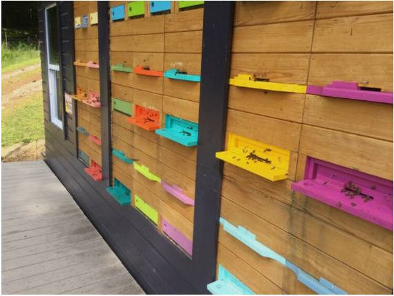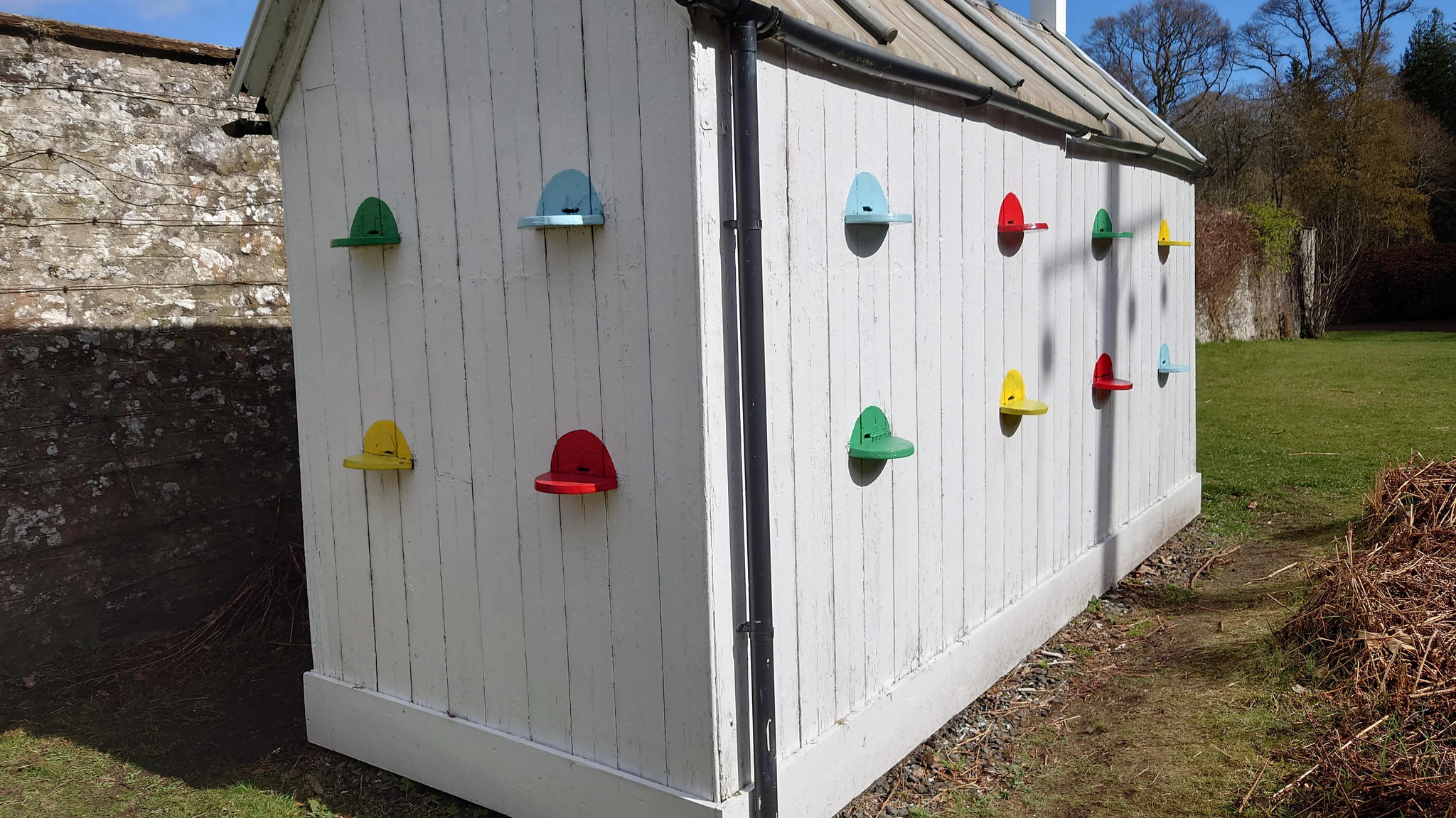 Это так называемый "словенский домик для пчел". Внутри расположены ульи, а цветные кружки - дверки для них. https://www.heathwing.com/slovenian-beehouse#:~:text=The hives in a Slovenian,for the beekeeper to work.