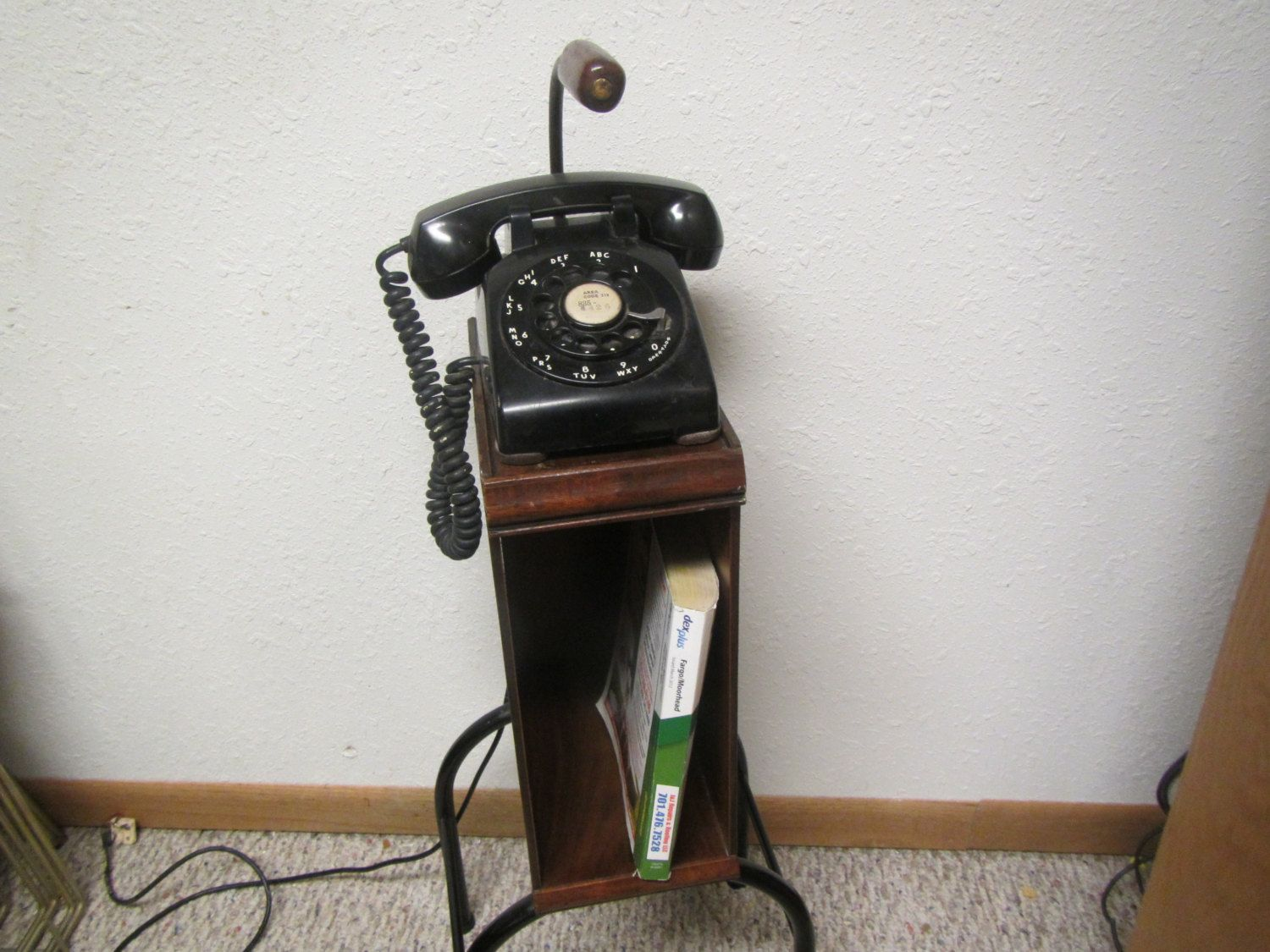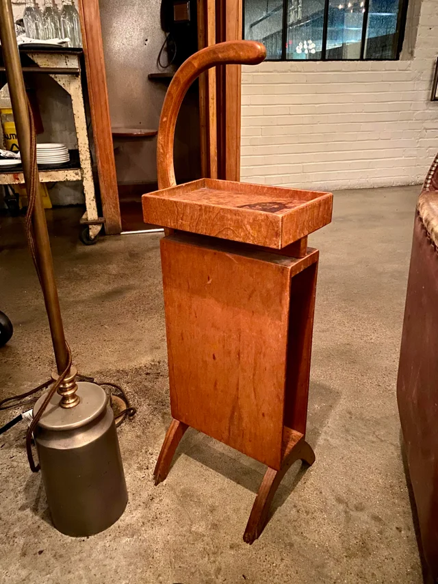 Это старая подставка под телефон. Сверху телефон, внутри телефонная книга. Изогнутая рукоятка - таскать стол :)