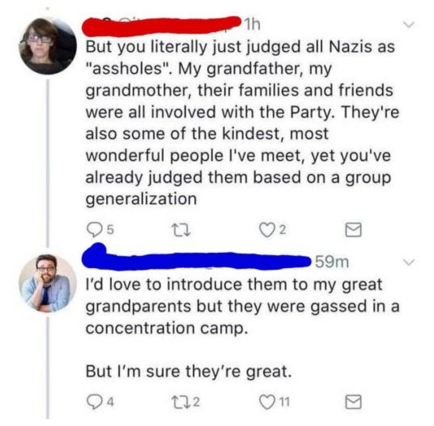 Но ты только что буквально назвал всех нацистов "жопошниками". Мой дедушка, моя бабушка, их семьи и друзья были так или иначе вовлечены в это. Но они, также, были одними из добрейших, великолепнейших людей что я когда-либо знала, а ты судишь их, ровняя под одну гребёнку просто из-за причастия к одной группе.