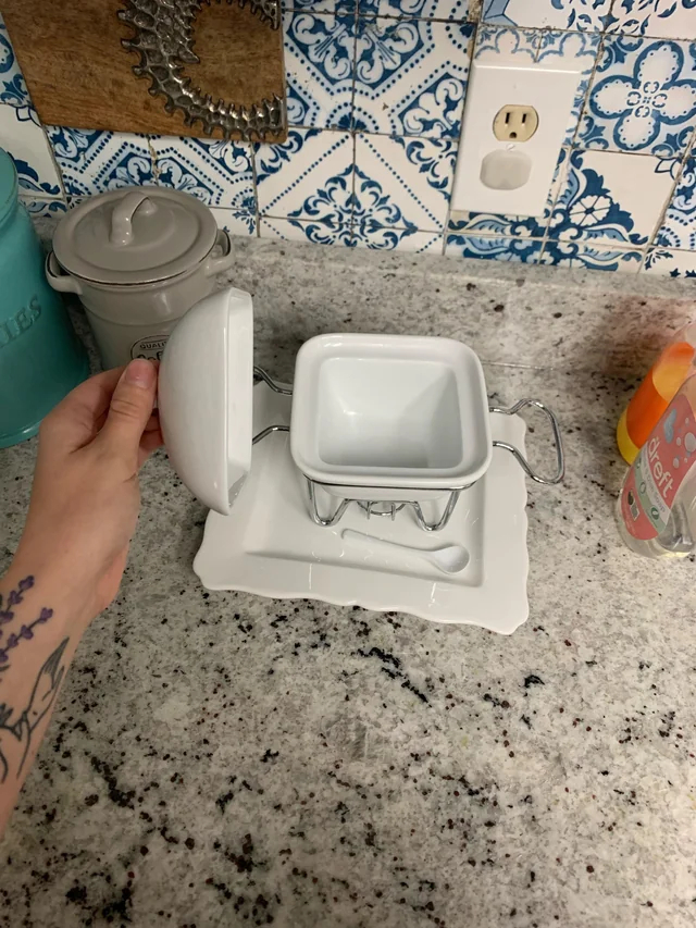 Это емкость для чего-нибудь подогреваемого. К примеру, подливки на праздничный стол. Под нее ставится свечка, которая и подогревает еду весь ужин.