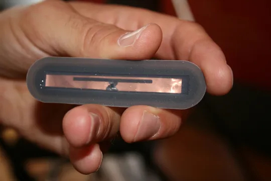 Это рефлектор - отражатель сигналов станции обнаружения при лавине, вшитый в куртку. Он пассивный, то есть пока детектор сигнал не пошлет, маячок не сработает. Зато и батареек не надо, это просто пластинка.