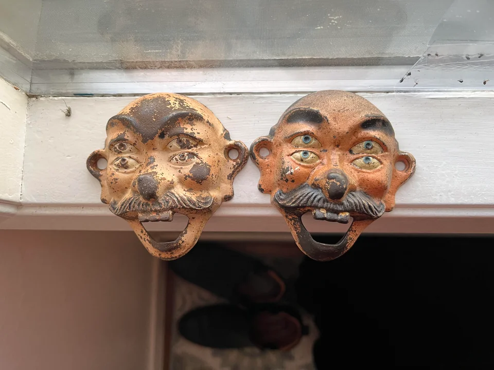 Это "horn trainers" - приспособление для коровьих рогов, которые начали расти вверх. При помощи него рога начинали опять расти вниз. Логика работы - они тяжелые :) Итог - рога не растут вверх, растут вниз и закругляются, быккорова не могут бодать рогами.
