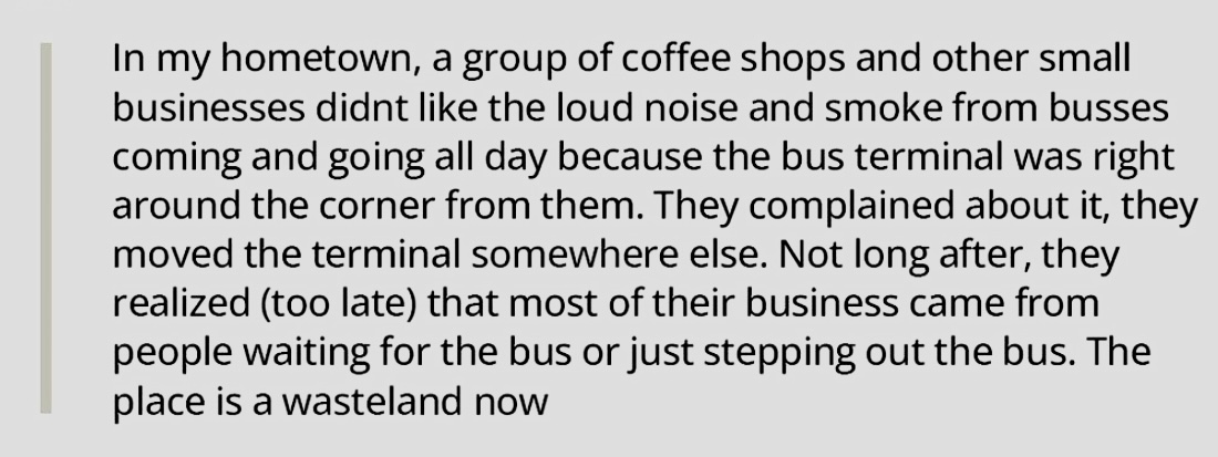 В моем городе группе кофейных магазинов и другим мелким предпринимателям не нравился громкий шум подъезжающих и отъезжающих автобусов к автовокзалу за углом. Они пожаловались, и автовокзал перенесли. Вскоре, они запоздало догадались, что большинство их покупателей были люди, ждущие автобусов, или только что приехавшие на них. Теперь там пустошь.