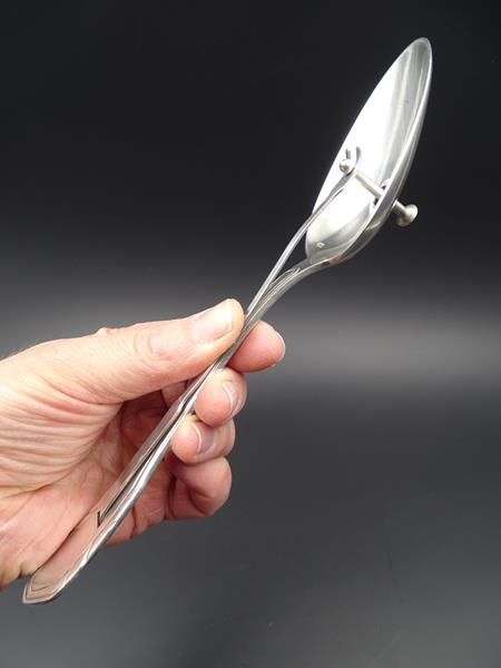 Это старая ложка для обезжиривания супа. Набрал ложку супа, жир вверху плавает. Слил немного супа, закрыл дырку, вылил куда-нибудь оставшийся жир.
