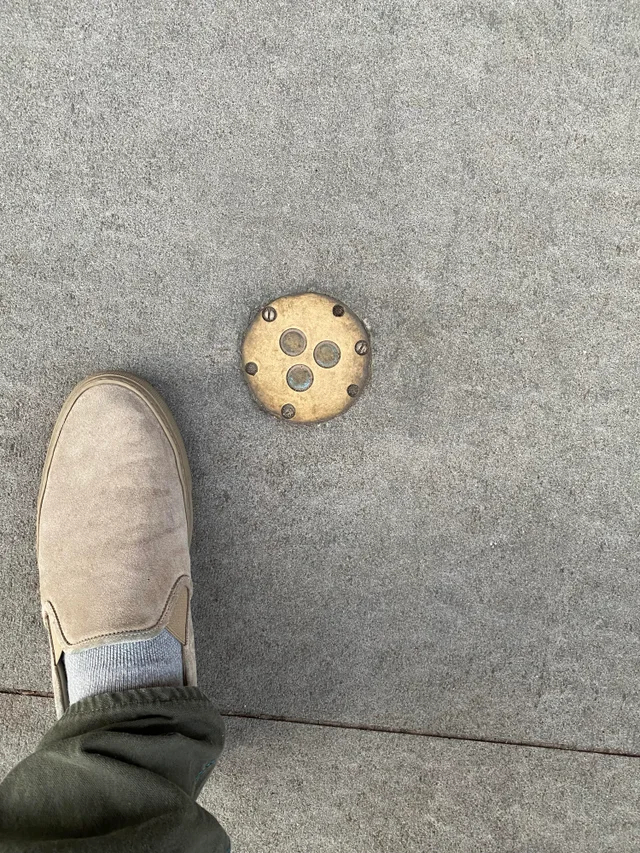 1.Я уже много лет прохожу мимо этой штуки. Изготовлена из латуни, вмурована в тротуар. Что это?