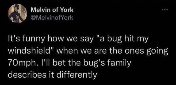 Забавно, что мы говорим: ‘Жук ударился о мое лобовое стекло’, хотя это мы едем со скоростью 70 миль в час. Уверен, что семья жука описывает это событие по другому.