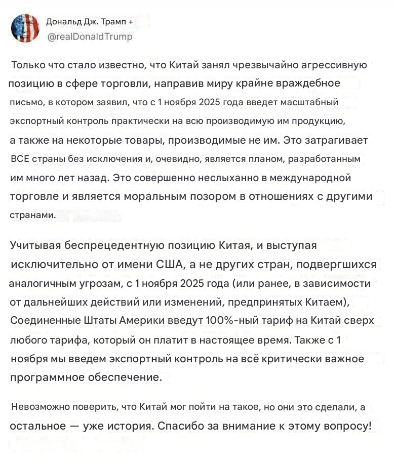 Конечно, Трамп на это пытается что-то сделать, угрожая пошлинами и блокировками. Но вы же помните, как он проиграл Пекину весной? Без китайских товаров экономика США загнётся, так что 100% тарифы - пустая угроза.