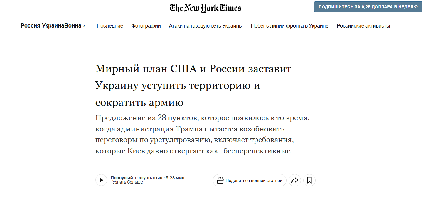 А Financial Times и вовсе пишет, что "Официальные лица США ожидают, что Зеленский подпишет соглашение «до Дня благодарения» (27 ноября), затем соглашение представят Москве, а процесс завершится до начала декабря", но это очень оптимистично.