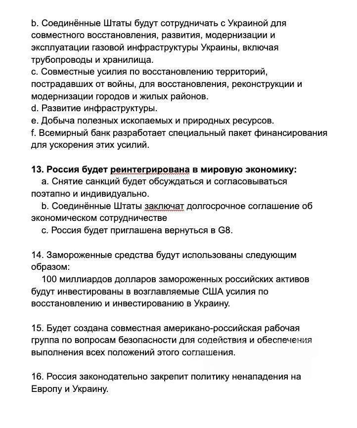 По словам чиновников, взамен на указанные в плане пункты Москва пообещает в дальнейшем не нападать на Украину или другие страны Европы и закрепит это обещание законодательно. 💬