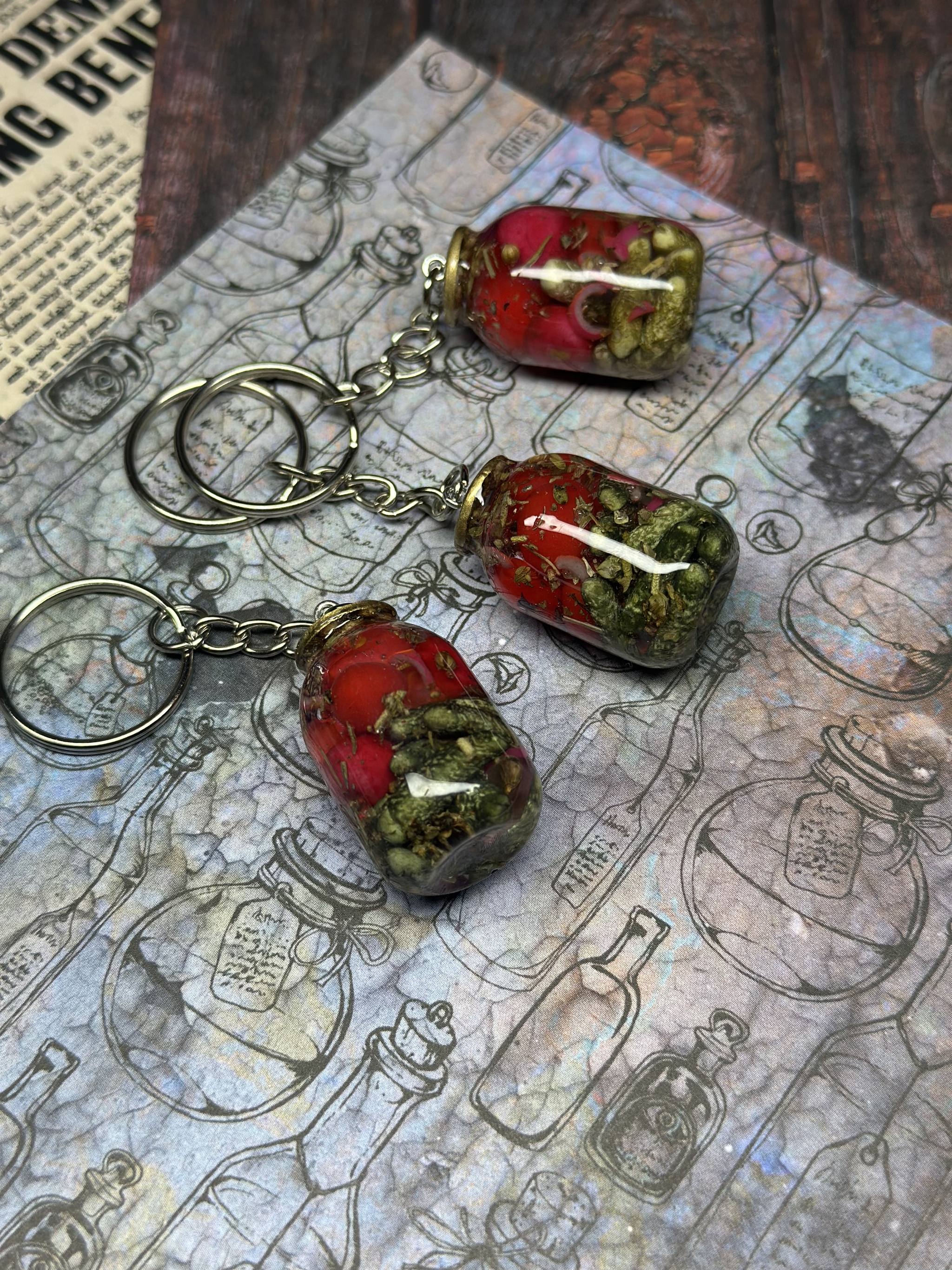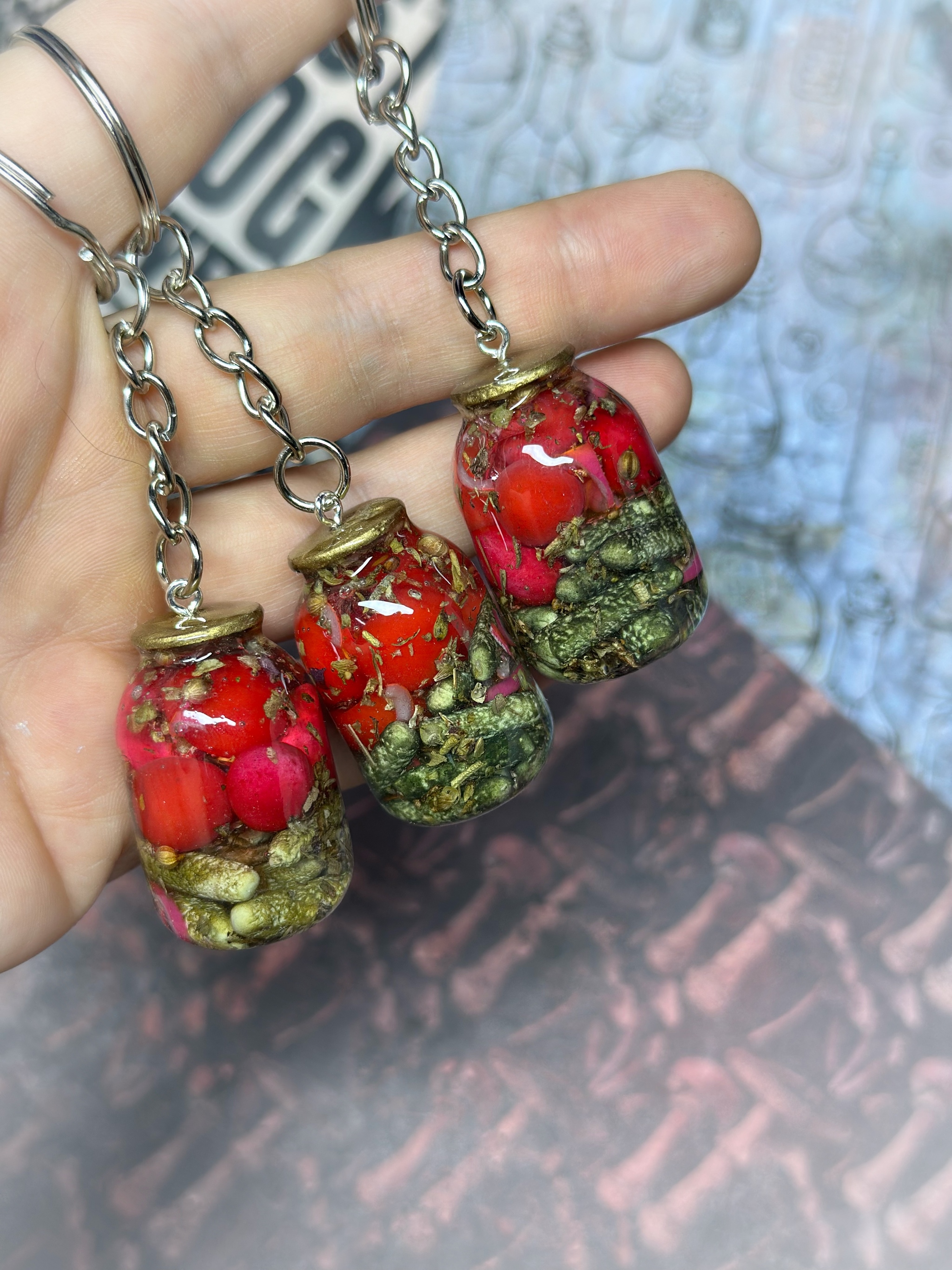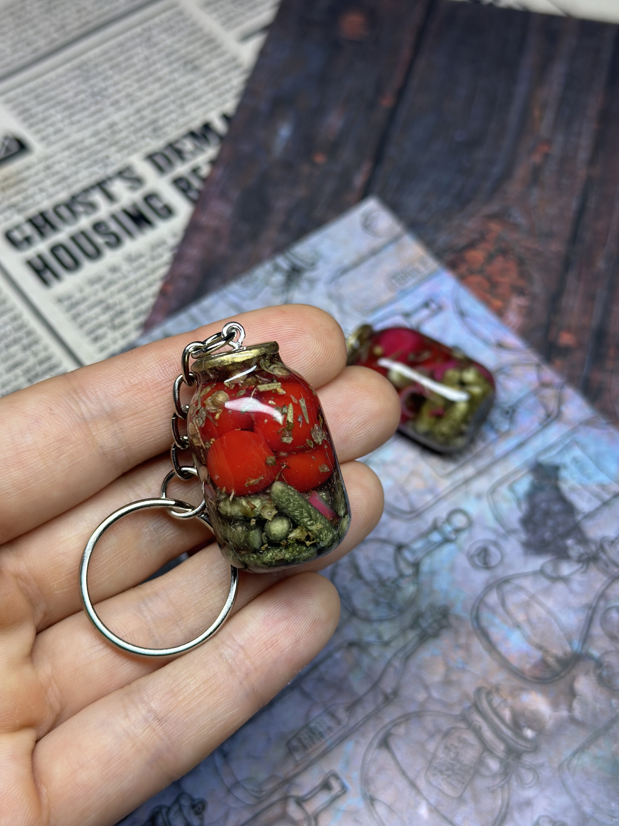 Брелок «Бабушкины заготовки» на фото выглядит как крошечная баночка-талисман, в которой будто застыло тёплое лето и запах деревенского погребка.