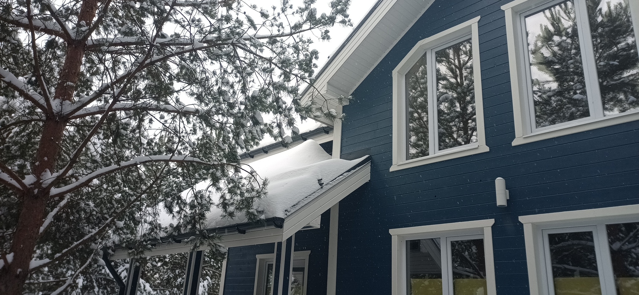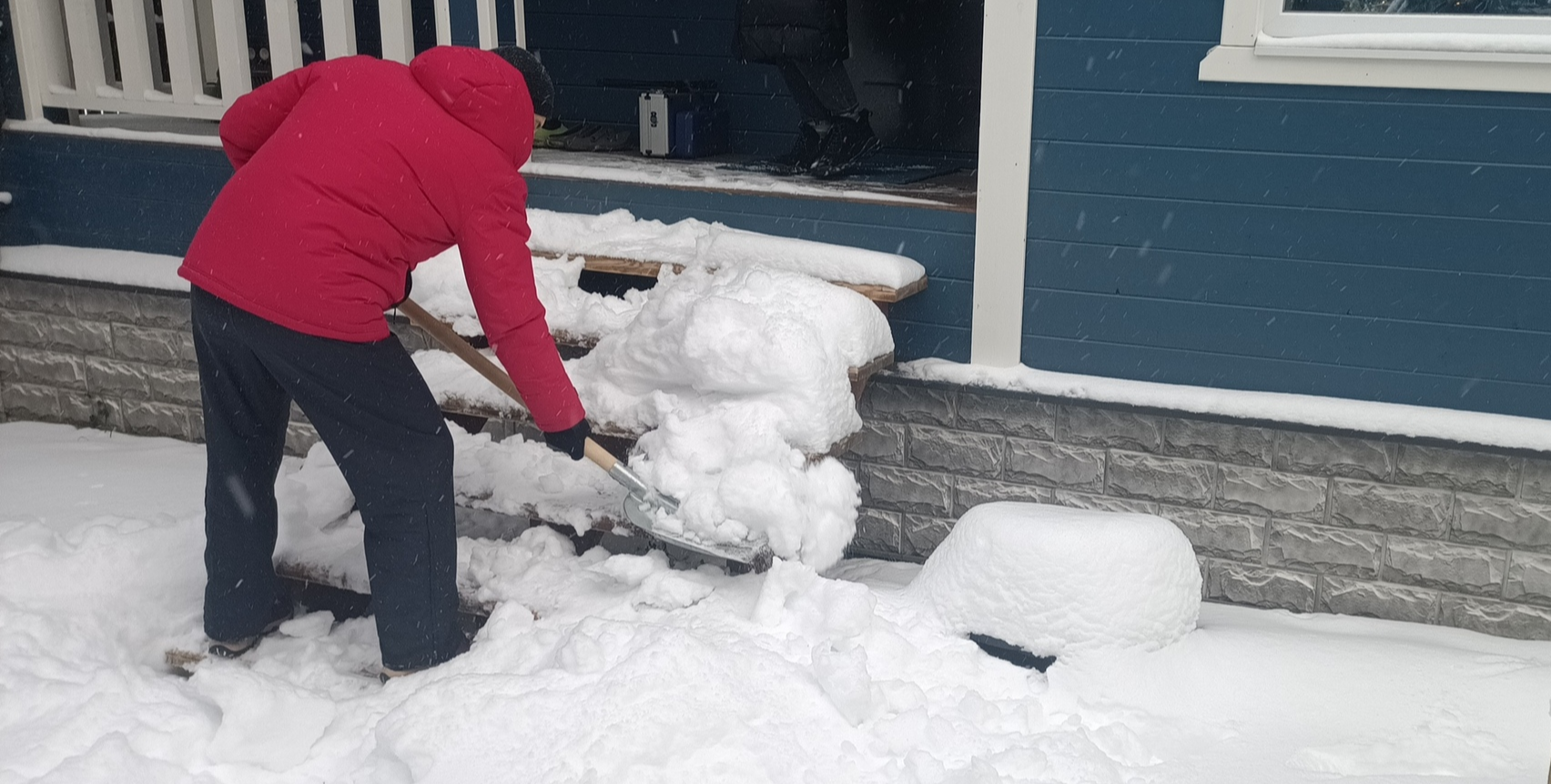 Несмотря на все снегозадержатели и водостоки. Специально для тех, которые сначала спорят, а потом смотрят - сначала смотрим на кровлю с фото выше и видим, что у неё есть снегозадержатели. Потом смотрим на мужика с лопатой. И видим, что они не помогают защитить крыльцо.