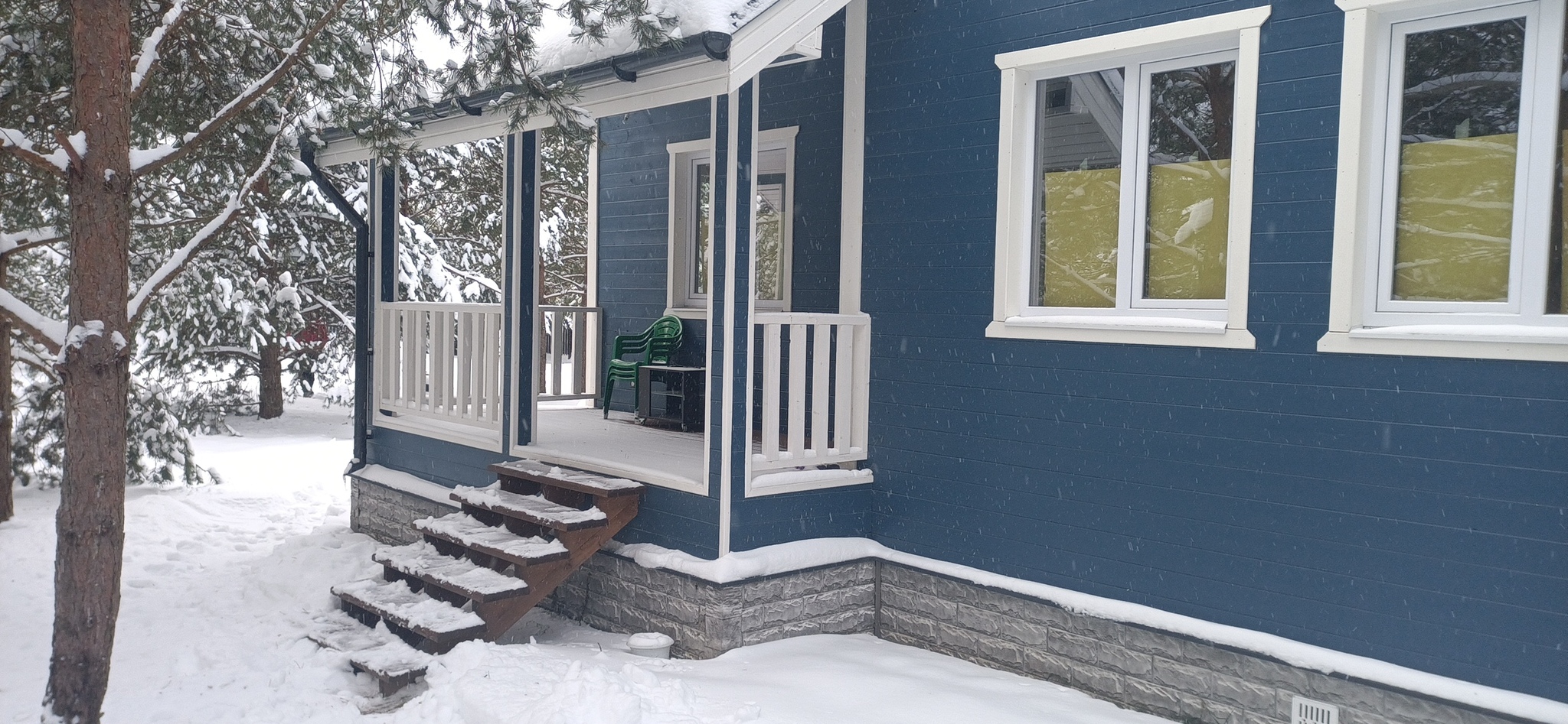 Разместите их там, где на голову ничего не упадёт. А ещё лучше, загоните их под крышу, чтобы их не заметало снегом. Вот здесь были все шансы пристроить односкатку, сохранив всю конфигурацию крыльца. Но они, по неведомой мне причине, зафигачили кукушку и направили скат в сторону подхода к крыльцу! Правда, шанс проскочить под свес с фронта всё же есть. Зайти под 90 градусов к ступеням. Удобно...