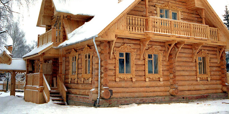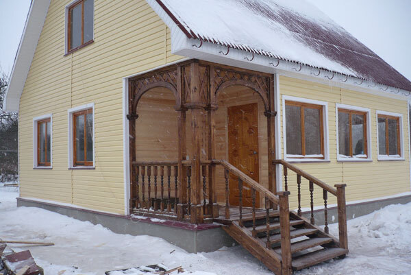 Тут хороший разгон для снега, водостоки уже оторвало. Надеюсь, хозяева живы. Взято с сайта строителей, кстати. И написано у них: "Дом без крыльца, как человек без лица". Тут без головы человек останется. Снег башка пападёт - савсэм мёртвий будет. Зато, смотрите какая резьба фигурная. Сборище дебилов. Почему не перенести его на 90 градусов, чтобы спасти своего заказчика от сотрясения мозга или перелома ноги? Нафига они поставили его прямо под скат?