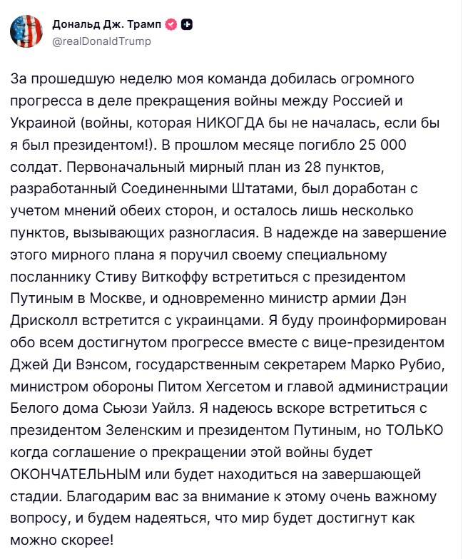 "Создание США и Европой фонда акций на $200 млрд для инвестирования в восстановление страны. Вашингтон также по-прежнему намерен разморозить российские средства, а согласованный процент инвестировать в восстановление Украины."💬