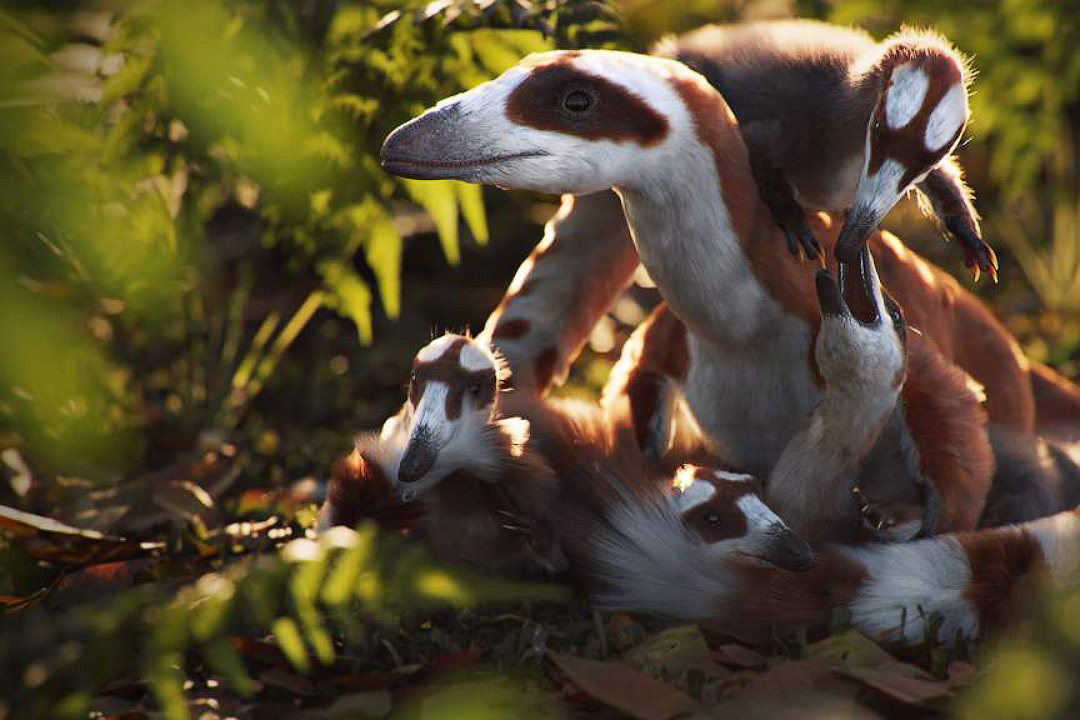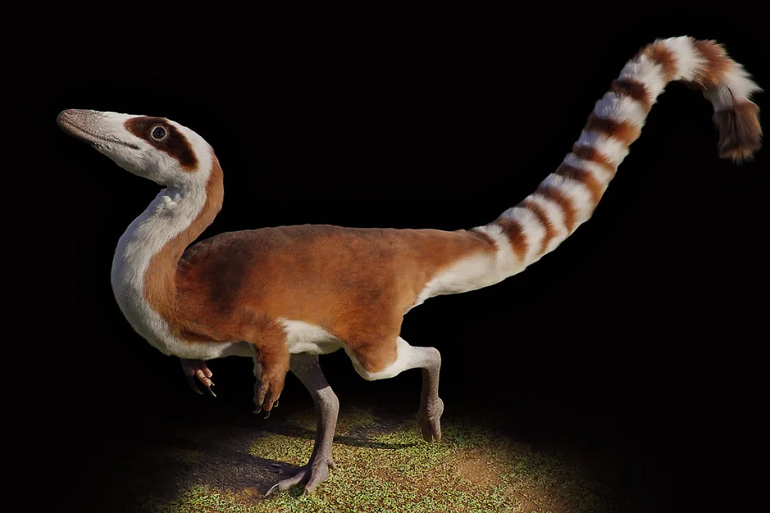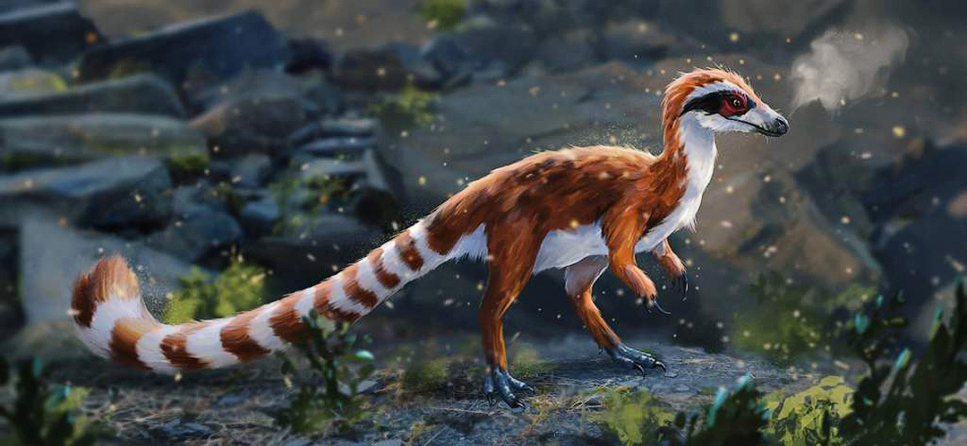 Так удалось восстановить, что спина у синозавроптерикса была каштановой, хвост мел чередующиеся бело-каштановые кольца, а на морде была маска, подобная той, что сейчас встречается у енотов.