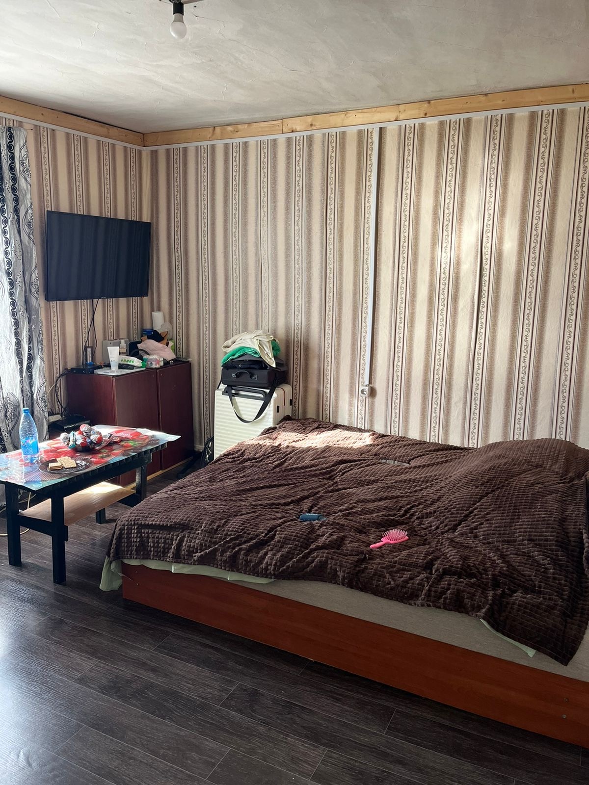 Шторы блэкаут, тюль, гирлянду на штору, два удлинителя, комнатный термометр, швабру, постельное белье 2х спальное(на работе выдают по два комлекта 1,5 спального каждому работнику),подушки, одеяло, плед, плитку газовую, фильтр для воды, кухонные принадлежности: тарелки, кружки, столовые приборы, кастрюлю, контейнеры, терку, сковороду, ножи, комплект всяких лопаточек и досточек.