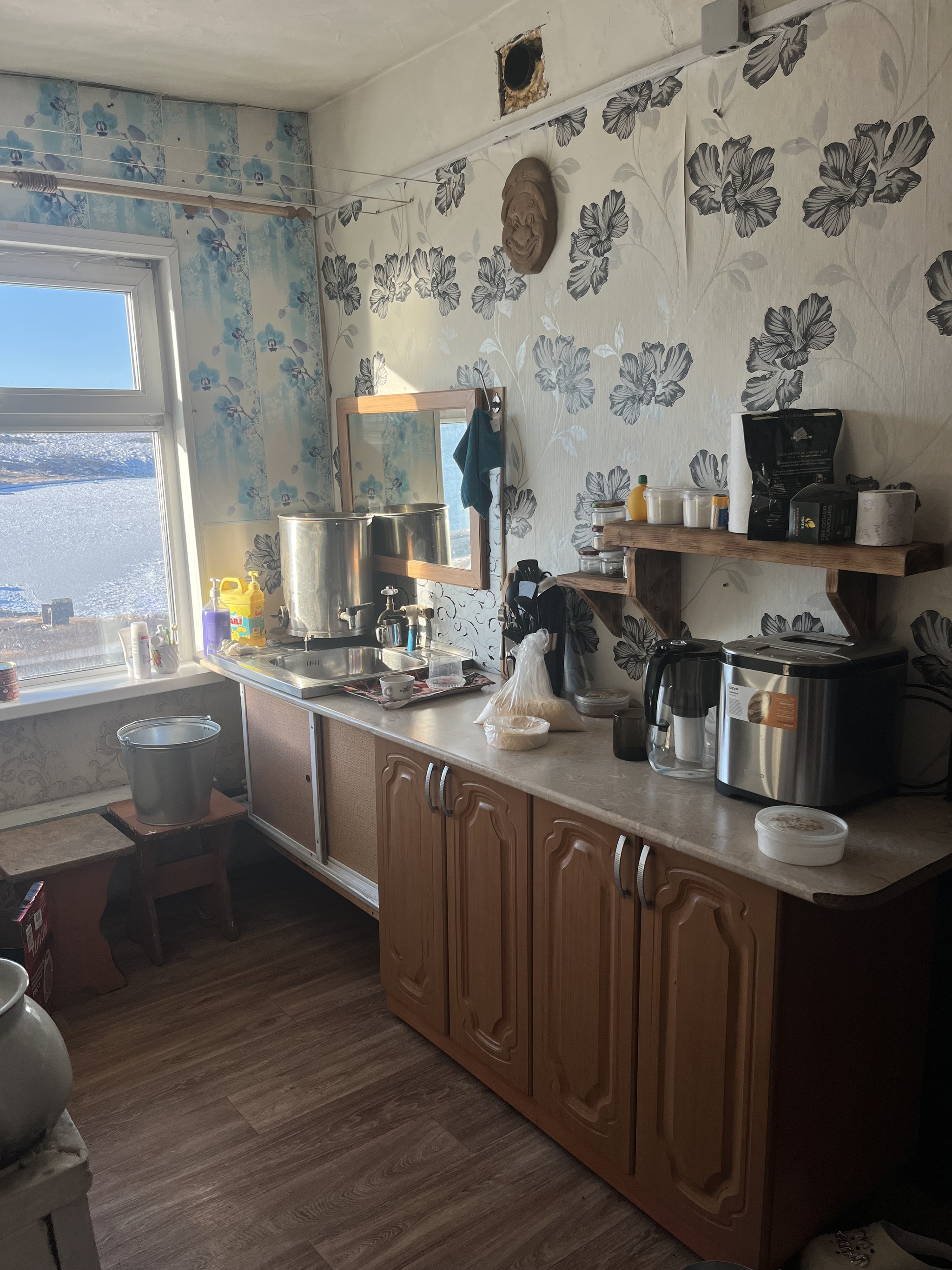 Служебно-жилой дом у нас старой постройки (на многих прибрежных станциях уже стоят новые дома), разделен на две жилые квартиры, служебное помещение и склад. В каждой квартире кухня и жилая комната, которая оснащена базовым набор мебели(кровать, шкаф, стол, стулья) и телевизор с телевизионной приставкой. Во всех четырех частях дома стоит кирпичная печь. Я видела, что многие спрашивали про туалет. Наша станция скорее исключение из правил, и туалет у нас не на улице, а в доме, он отапливаемый. Там же стоит стиральная машина полуавтомат. Но есть еще и уличный туалет. «ДЫРКА»! Но туда никто не ходит и ,видимо, уже давно, так как дорожка из досок рядом держится на «честном слове». Когда мы только приехали, мы заселились в первую квартиру, а во второй должна была жить начальница станции. В нашей квартире были деревянные окна, которые пришлось заклеивать, чтобы с них не дуло, и подобие кухонного гарнитура. Но этого и стоило ожидать, тут все-таки не курорт:)