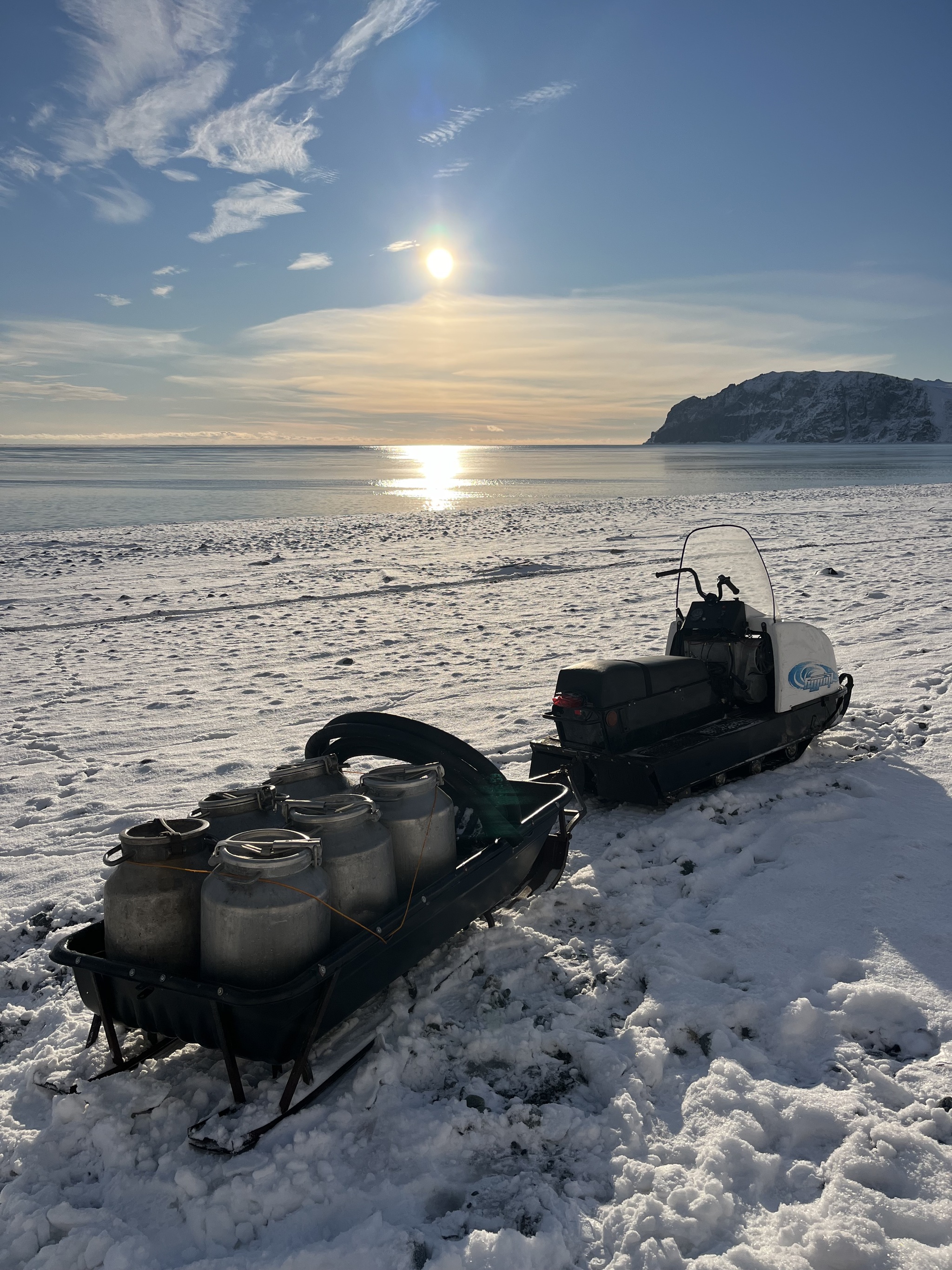 Но для меня ходить пешком к морю все равно удобнее, чем трясись в телеге трактора и санях снегохода😁 Был случай, как на кочке выпал штырь, соединяющий телегу и трактор, и Андрей просто уехал без меня оставив меня в телеге на дороге😅