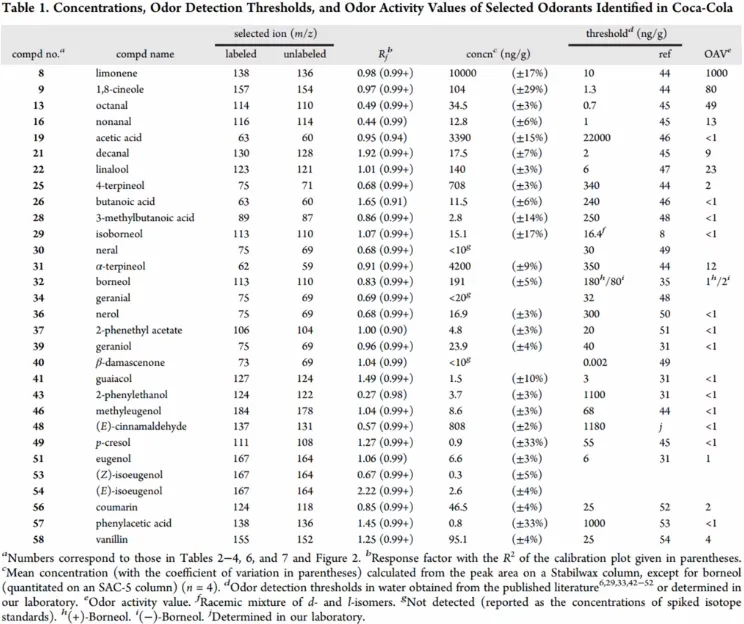 Масс-спектрометрия показывает относительную интенсивность, а не концентрацию, поэтому Зак обратился к статье из академического журнала Journal of Agricultural and Food Chemistry с измеренными концентрациями практически всех ароматических веществ в Coca-Cola.