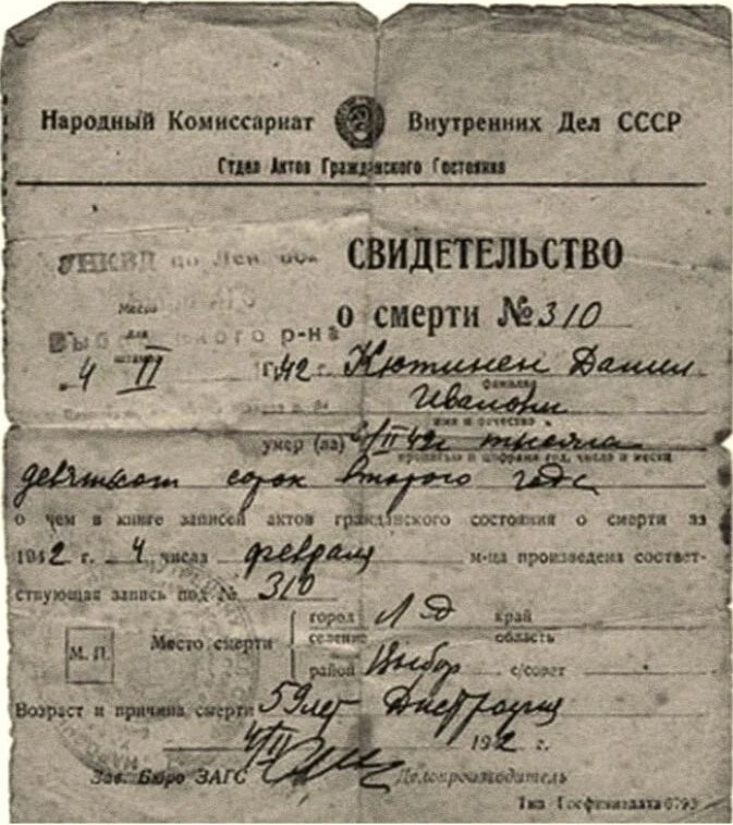 3 февраля 1942 года в блокадном Ленинграде умер от голода Даниил Иванович Кютинен – пекарь, работавший непосредственно на выпечке хлеба. Он умер от истощения прямо на рабочем месте – в пекарне блокадного Ленинграда.