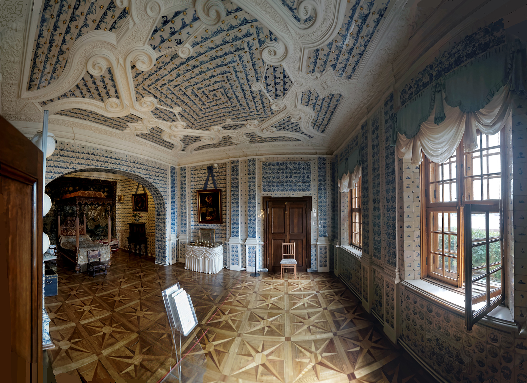 Чем известен дворец Меншикова на Университетской набережной? Тем, что в нем есть помещения полностью отделанные голландской расписной плиткой. Полностью — это буквально полностью. Даже потолок. Зачем потолок? Ну, во-первых это красиво. Во-вторых плитка оооочень дорогая, а у нас денег столько, что мы ей сейчас тут все на свете отделаем. И отделали: