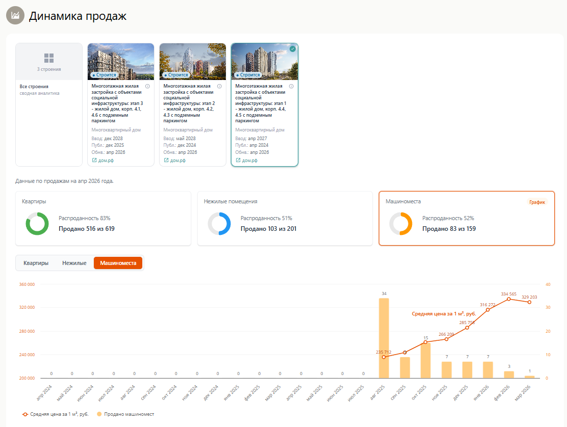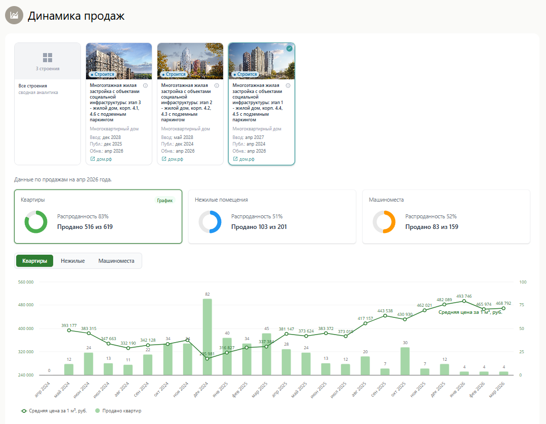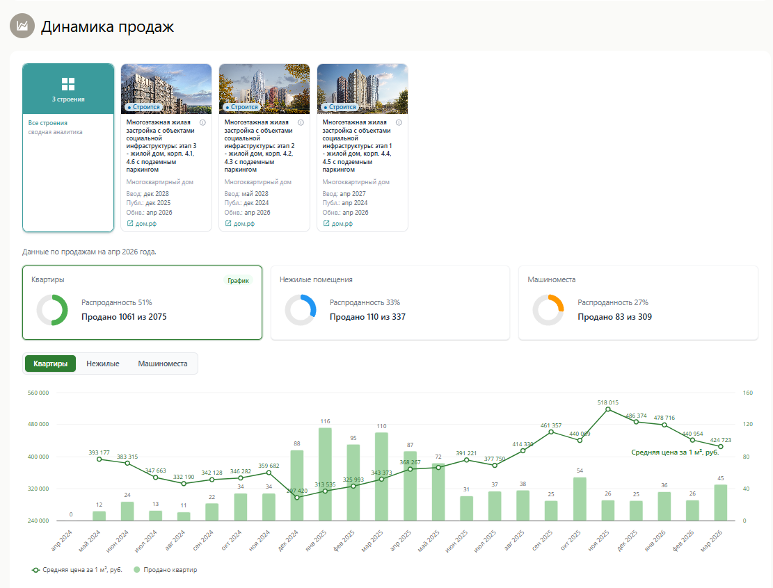 Тут видно динамику продаж по конкретным корпусам ЖК вплоть до марта 2026 года. Средняя цена за квадратный метр, количество проданных квартир по месяцам. Всё на одном графике.