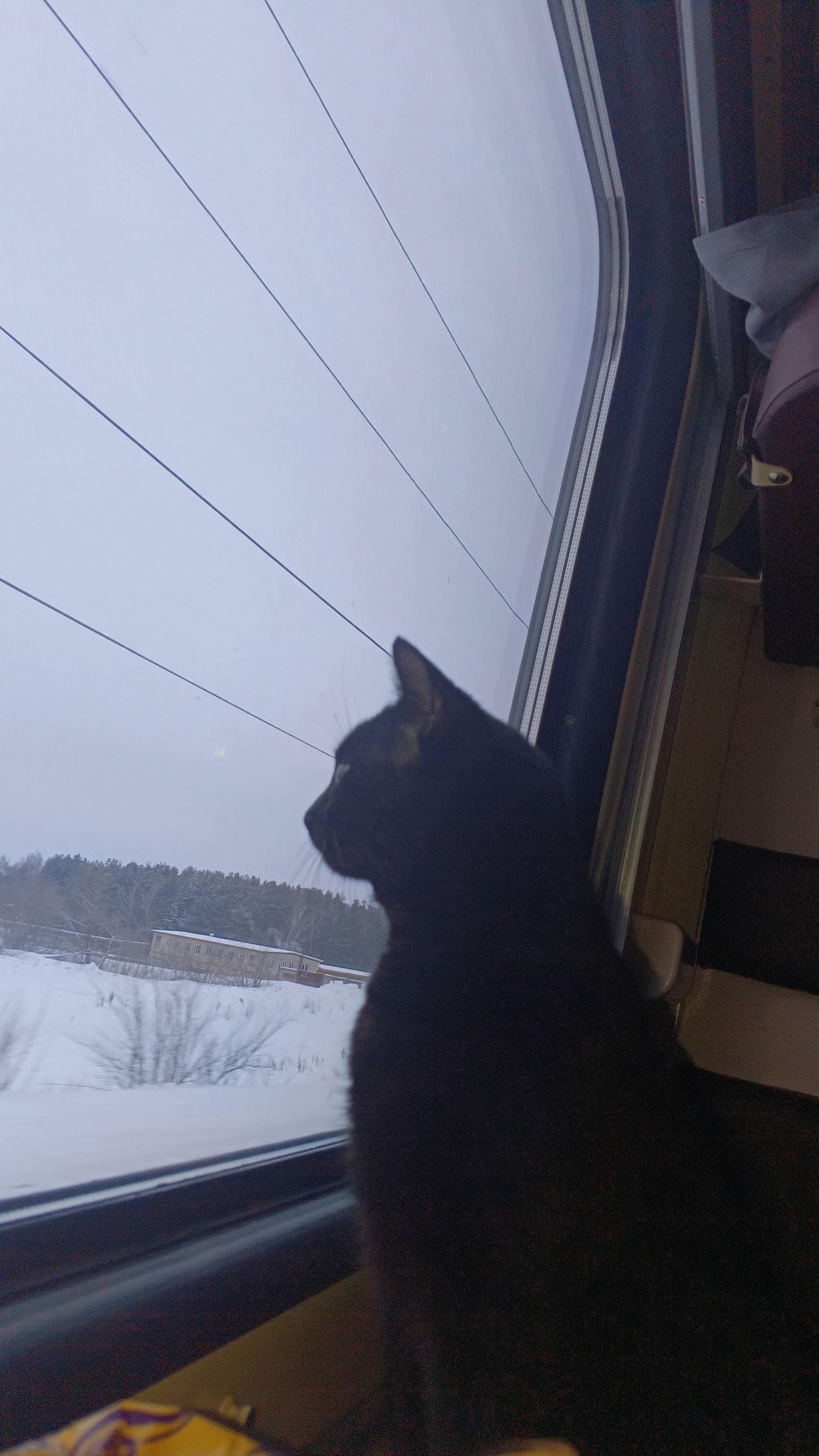Кот очканул один раз, когда состав тронулся, я над ним засмеялся 😁, он залез сам в ненавистную переноску). Довольно быстро освоился. Постелил ему свою кофту на его половину столика - ему интересно в окно палить было.
