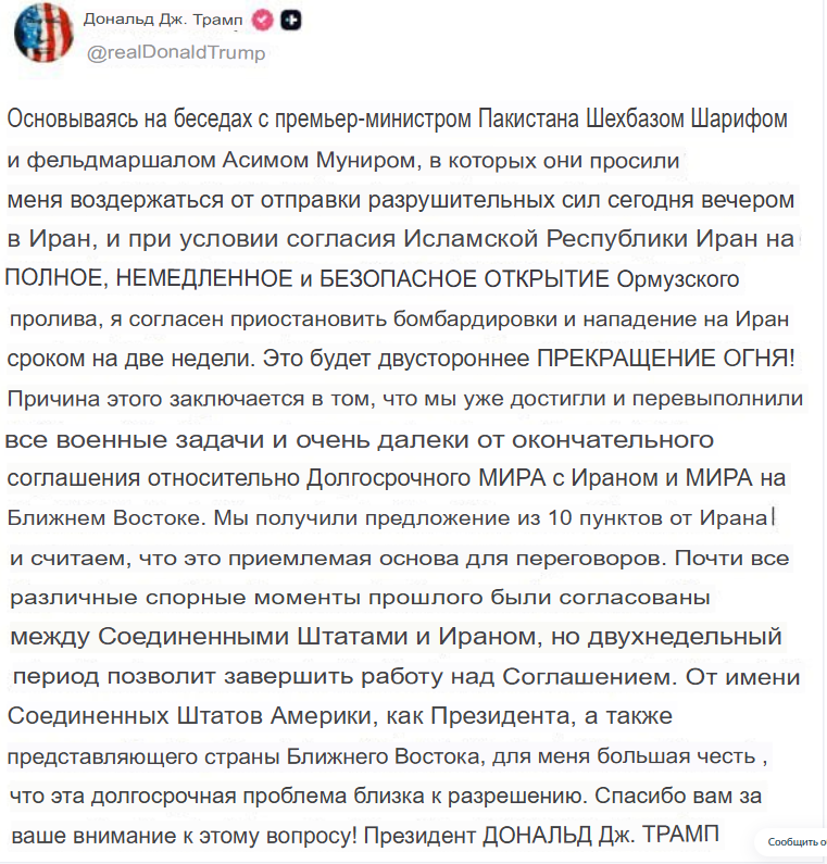 Опять посмотрите на пост Трампа: "Мы получили от Ирана предложение из 10 пунктов и считаем, что это рабочая основа для переговоров"