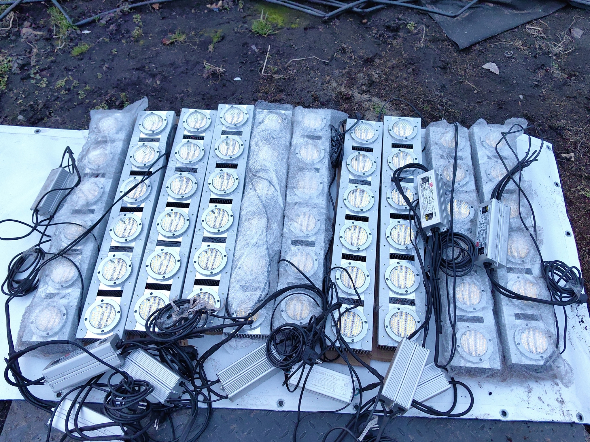 Пока рассада ютилась под лампами, мне нужно было подготовить теплицу к большому переезду. У меня было 13 дней с того момента, как тыквы проросли. В целом, этого всегда достаточно для первичных подготовлений. Одним особым нововведением был свет. Нет, не солнца свет и не звездный, и даже лунный свет померк. Лишь бы свет ваших очей всегда светил. Ребята из компании Rootster подарили мне набор ламп со словами: «Чувак, у тебя крутые тыквы, и мы хотим, чтобы они стали самыми большими в мире. Возьми наши лампы, пусть они тебе помогут». Лампы для рассады? Уж нет, нечто посерьезнее и помощнее. Всего мне привезли 10 фитоизлучателей по 500 ватт каждый, и в совокупности это дает 5 киловатт света. Вообще, мне предлагали на всю теплицу по максимуму, но, боюсь, сеть моего СНТ не выдержит таких нагрузок (и мой кошелек), поэтому я ограничился досветкой, рассчитанной на одну половину теплицы.