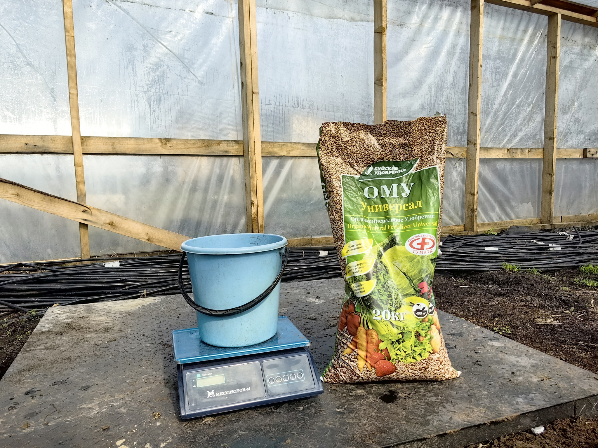 В общем, я взял мешок Буйских удобрений, а именно ОМУ Универсал, и рассыпал по земле из расчета 500 грамм на каждый квадратный метр.