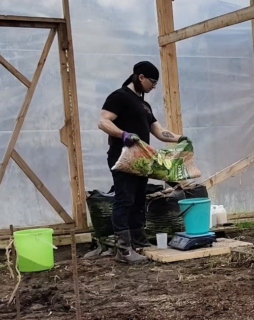 Размер моей теплицы 16 на 10 метров. Получается 160 квадратных метров, и на этой территории будет расти две тыквы, а значит, делим ее пополам и получаем 80 квадратных метров на одну тыкву. С прошлого года в земле зарыт греющий кабель, я не стал его выкапывать, да и зачем? Раз уж все равно буду опять тут тыквы сажать, то пусть лежит. Тем более нет надобности копать огромную яму и наполнять ее удобрениями. Всё питание достаточно вносить в верхний слой земли, примерно до 30 см. Примерные участки быстро наметил и пора в них запихнуть изрядное количество удобрений. Ничего нового придумывать не буду, надо использовать то, что уже работает, и только улучшать определенные моменты. Например, в прошлом году я внес на начальной стадии мало удобрений, и пришлось постоянно подсыпать, чтобы растения развивались должным образом.