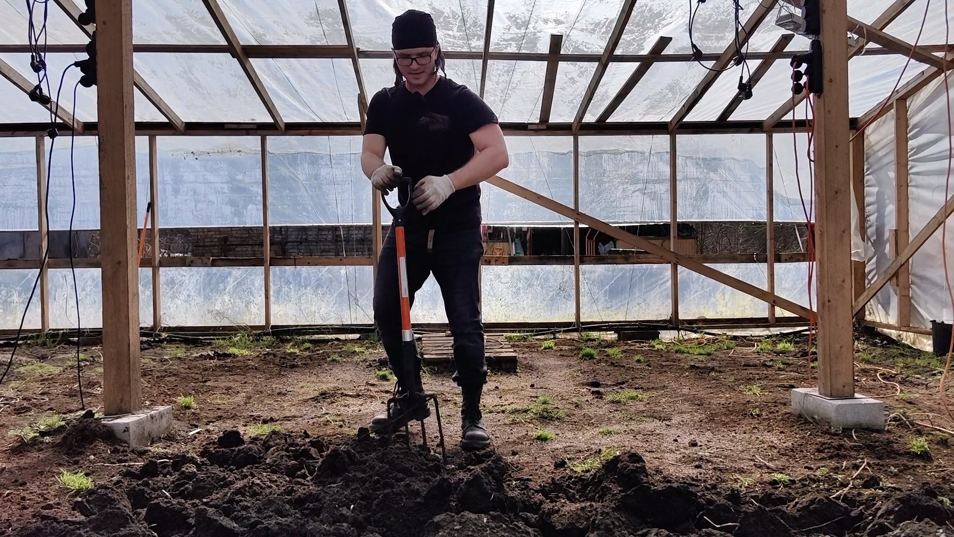 В этом году я решил застелить всю теплицу агроволокном от сорняков. Тут свои плюсы и минусы. Плюсы, конечно же, будут заключаться в отсутствии сорняков. Когда они растут под листьями тыквы, то это создаёт препятствия для циркуляции воздуха, влажность повышается, и как следствие, растение начинает болеть. Но при этом мне придётся делать прорези под каждое междоузлие, чтобы тыква пускала корни. Данный процесс сильно увеличит время, которое будет уходить на обслуживание этих растений. С другой стороны, я сражаюсь за результат, а не за время.