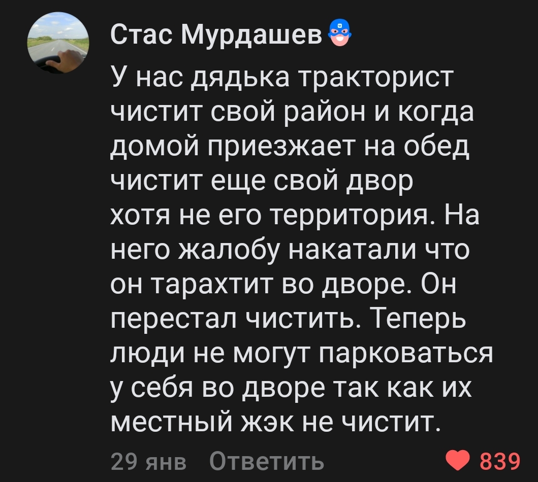 Увидел такой коммент под роликом про трактористов, пришли к выводу, что трактористы ровные парни и при возможности помогают окружающим.