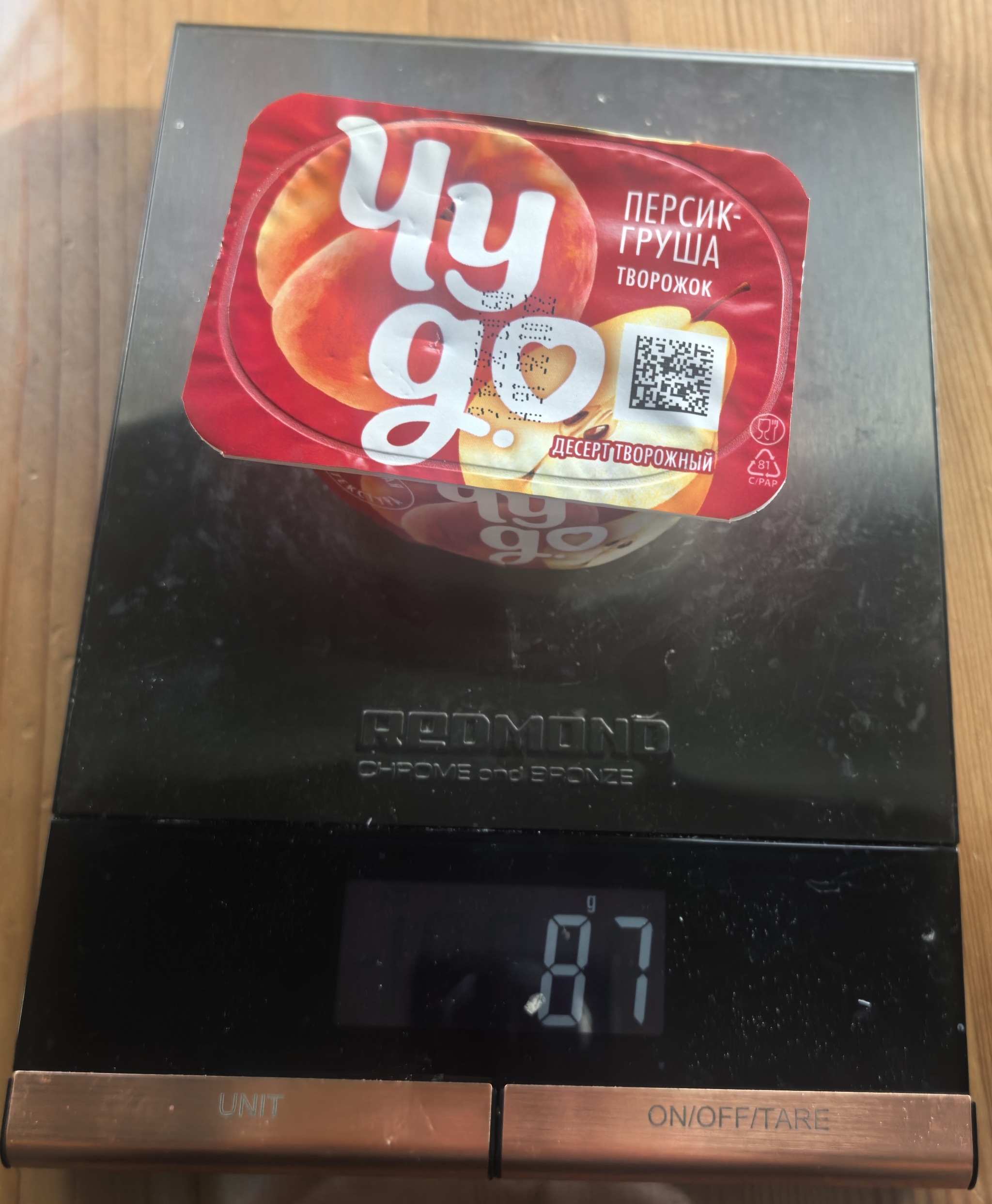 Итого, из веса творожка с упаковкой вычитаем массу стаканчика и крышки: 87-6-1=80.