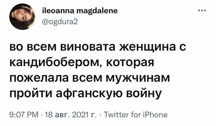 После новостей о том, что в Афганистане сменилась власть, там решили установить шариат, что парки, бассейны, и т.д. закрывают, что люди боятся выходить из дома и что права женщин там прямо пиздец как сократили - их просто перевели в какую-то собственность, в вещь и я охренел. Посмотрел на жену, которая лежала рядом, прикинул мысленно это всё на неё и охуел. А потом обрадовался, что не в Афганистане живу, хотя и раньше ниразу об этом не расстраивался.